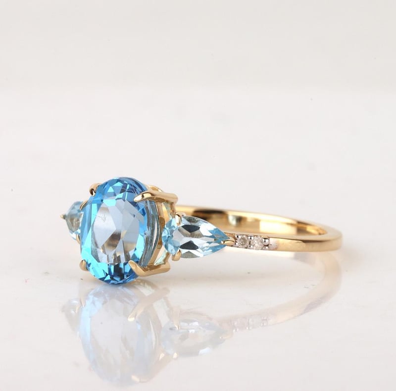 The Ring Consists Of (1) Oval Brilliant Natural Swiss Blue Topaz & (2) Pear Brilliant Cut Swiss Blue Topaz. Surrounding The Main Stones Are Round Brilliant Cut Natural Diamonds.
