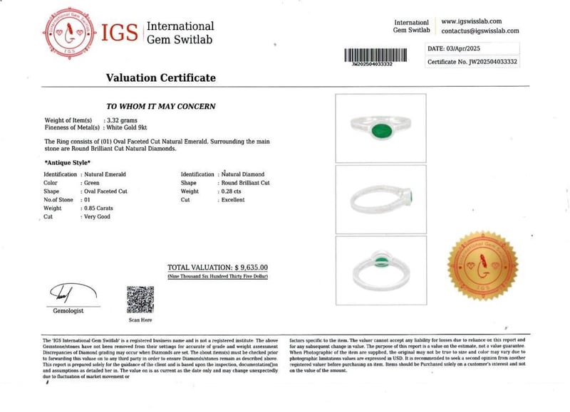 9CT WHITE GOLD EMERALD AND DIAMOND RING Valuations Provided by an Independent Third-Party Professional Not Directly Associated With Lloyds Auctions at AUD $9635 This valuation has been conducted by an independent third-party professional. The valuation amount is an assessment by the issuing valuer and does not reflect the auction value of the item. Any inquiries regarding the valuation should be directed to the issuing valuer (refer to contact details on the certificate), as Lloyds Auctions has no affiliation or influence over the valuation, the valuer, or the stated amount. Condition: Good - Refer Images 0 +33332
