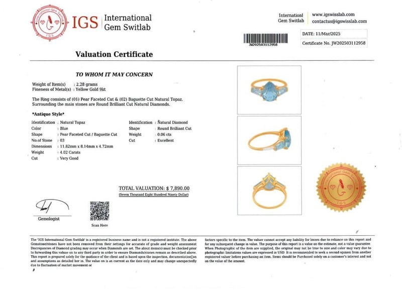 9CT YELLOW GOLD BLUE TOPAZ AND DIAMOND RING Valuations Provided by an Independent Third-Party Professional Not Directly Associated With Lloyds Auctions at AUD $7890 This valuation has been conducted by an independent third-party professional. The valuation amount is an assessment by the issuing valuer and does not reflect the auction value of the item. Any inquiries regarding the valuation should be directed to the issuing valuer (refer to contact details on the certificate), as Lloyds Auctions has no affiliation or influence over the valuation, the valuer, or the stated amount. Condition: Good - Refer Images 0 +112958