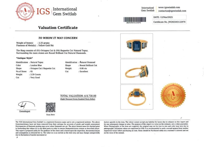 9CT YELLOW GOLD BLUE TOPAZ AND DIAMOND RING. Valuations Provided by an Independent Third-Party Professional Not Directly Associated With Lloyds Auctions at AUD $8730 This valuation has been conducted by an independent third-party professional. The valuation amount is an assessment by the issuing valuer and does not reflect the auction value of the item. Any inquiries regarding the valuation should be directed to the issuing valuer (refer to contact details on the certificate), as Lloyds Auctions has no affiliation or influence over the valuation, the valuer, or the stated amount. Condition: Good - Refer Images 0 +122976