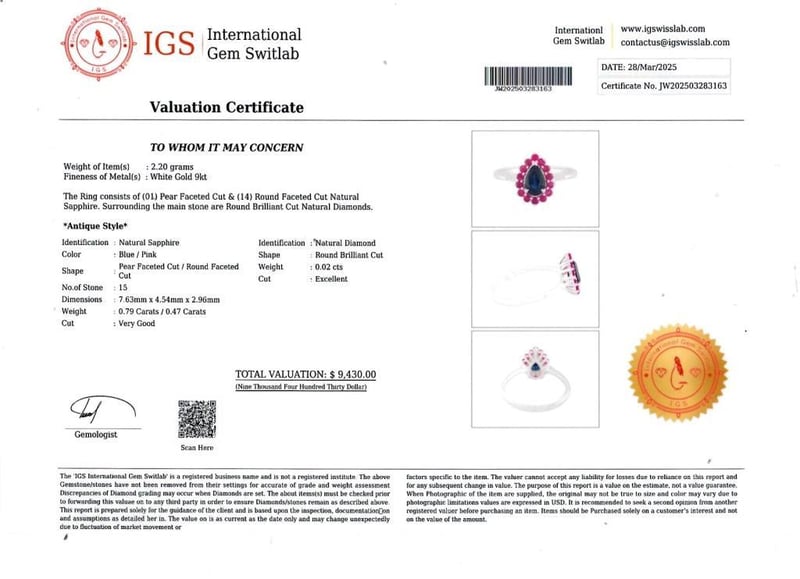 9CT WHITE GOLD BLUE AND PINK SAPPHIRE AND DIAMOND RING Valuations Provided by an Independent Third-Party Professional Not Directly Associated With Lloyds Auctions at AUD $9430 This valuation has been conducted by an independent third-party professional. The valuation amount is an assessment by the issuing valuer and does not reflect the auction value of the item. Any inquiries regarding the valuation should be directed to the issuing valuer (refer to contact details on the certificate), as Lloyds Auctions has no affiliation or influence over the valuation, the valuer, or the stated amount. Condition: Good - Refer Images 0 +283163