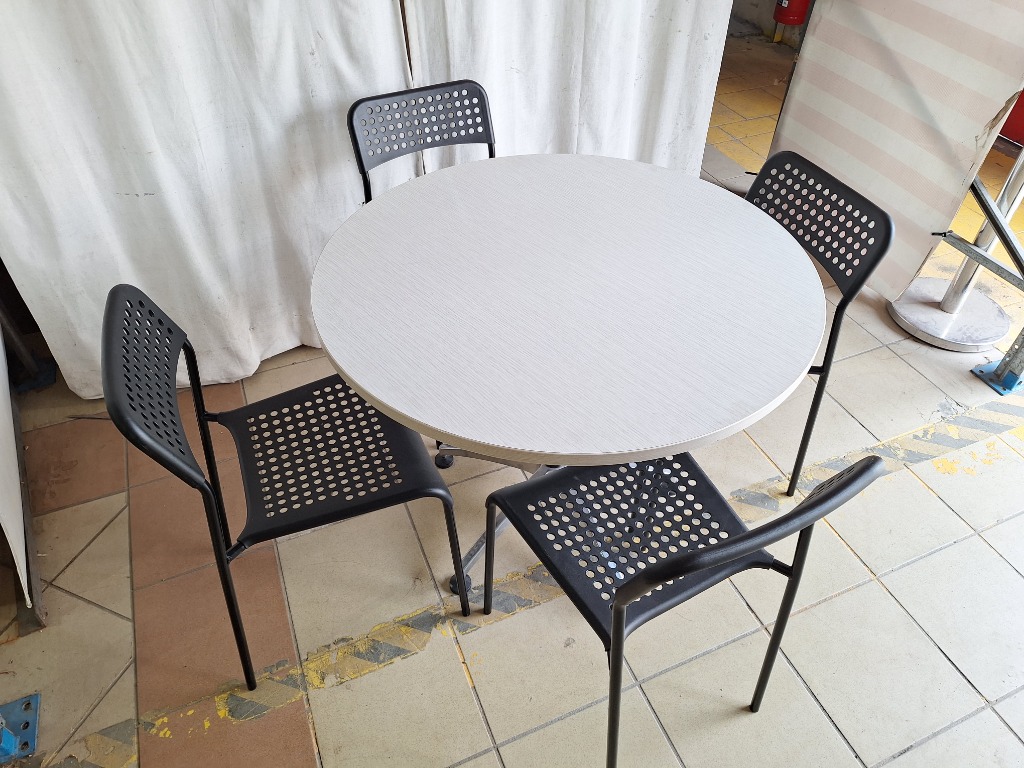 4 Seater Dining table, Timber & Metal Style, Black & White FinishDimensions Chair H:77cm W:38cm D:46cmDimensions Table H:73cm W:90cm D:90cmSOLD AS LOT