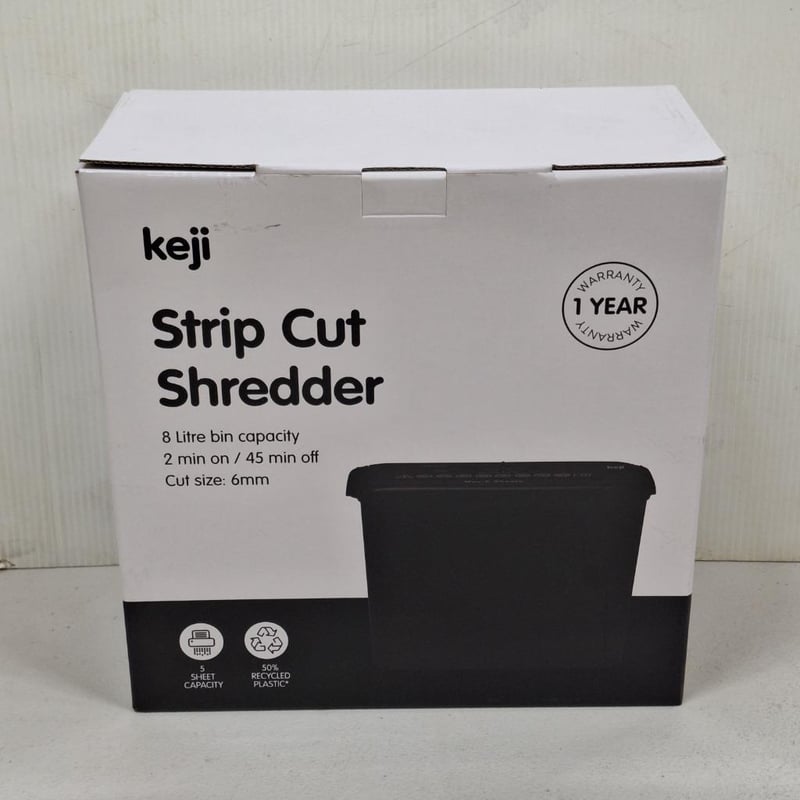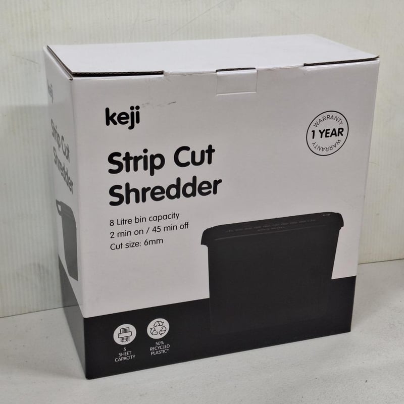 RRP $35.00 KE5SHSCSR, Keji Strip Cut Shredder. This Keji Strip Cut Shredder is perfect for destroying sensitive, private, and confidential documents efficiently. It has a lift-off bin with an 8L capacity and can shred 5 sheets at one time. It has a reverse function to clear jams and 220mm entry width to ensure efficient cutting.