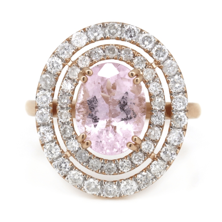 14K ROSE GOLD, MORGANITE AND DIAMOND, DOUBLE HALO RING. The Design Features, One, Oval Cut, Moderate Light Pink, Morganite (2.80Ct, Slightly Included), Double 4 Claw Set Basket Setting. Encompassing The Design Are, 49 Round Brilliant Cut, Diamonds (1.02Ct Tdw, H-I Colour, Si2-P1 Clarity), Bead Set. Ring Size P. Valuations Provided by an Independent Third-Party Professional Not Directly Associated With Lloyds Auctions at AUD $$10,000.00This valuation has been conducted by an independent third-party professional. The valuation amount is an assessment by the issuing valuer and does not reflect the auction value of the item. Any inquiries regarding the valuation should be directed to the issuing valuer (refer to contact details on the certificate), as Lloyds Auctions has no affiliation or influence over the valuation, the valuer, or the stated amount. Condition: Good - Refer Images 0645847+41