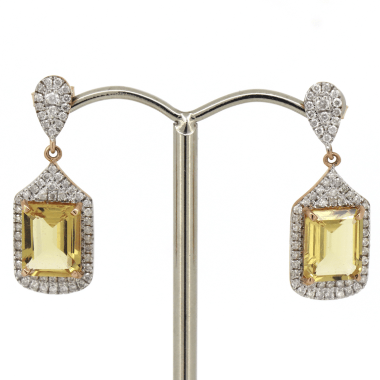 14K ROSE GOLD, GOLDEN HELIODOR AND DIAMOND, DROP EARRINGS. The Centres Feature, 2 Emerald Cut, Medium Deep Golden Yellow, Heliodor (3.62Ct Tsw, Slightly Included), 4 Claw Set. Encompassing The Design Are, 116 Round Brilliant Cut, Diamonds (0.64Ct Tdw, I-K Colour, Si2-P2 Clarity), Bead Set. The Earrings Have Post Backs, With 14K Rose Gold Butterfly Claps. Valuations Provided by an Independent Third-Party Professional Not Directly Associated With Lloyds Auctions at AUD $$11,250.00This valuation has been conducted by an independent third-party professional. The valuation amount is an assessment by the issuing valuer and does not reflect the auction value of the item. Any inquiries regarding the valuation should be directed to the issuing valuer (refer to contact details on the certificate), as Lloyds Auctions has no affiliation or influence over the valuation, the valuer, or the stated amount. Condition: Good - Refer Images 0645847+89