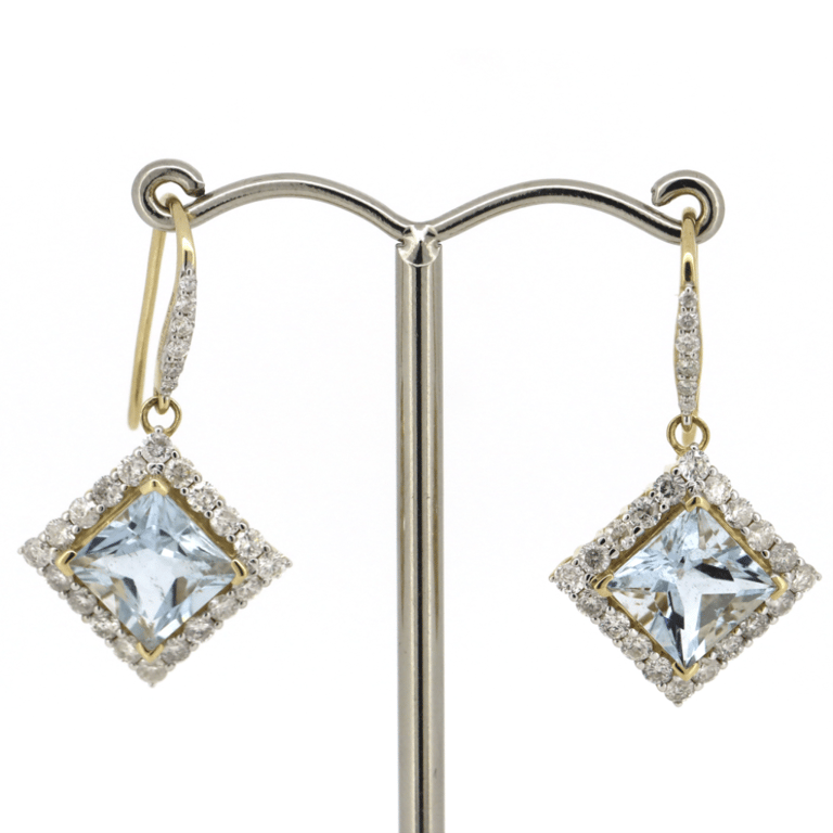 14K YELLOW GOLD, AQUAMARINE AND DIAMOND, DROP EARRINGS. The Drops Features, 2 Square Cut, Pale-Moderate Blue, Aquamarines (4.18Ct Tsw, Slightly Included), Claw Set. Surrounding The Stones And Decorating The Hooks Are, 52 Round Brilliant Cut, Diamonds (1.48Ct Tdw, H-K Color, P2+ Clarity), Claw Set. The Earrings Have Shepherd Hooks. Valuations Provided by an Independent Third-Party Professional Not Directly Associated With Lloyds Auctions at AUD $$8,700.00This valuation has been conducted by an independent third-party professional. The valuation amount is an assessment by the issuing valuer and does not reflect the auction value of the item. Any inquiries regarding the valuation should be directed to the issuing valuer (refer to contact details on the certificate), as Lloyds Auctions has no affiliation or influence over the valuation, the valuer, or the stated amount. Condition: Good - Refer Images 0645847+77