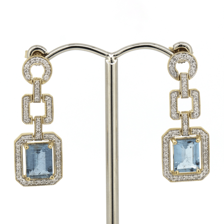 14K YELLOW GOLD, AQUAMARINE AND DIAMOND, DROP EARRINGS. The Design Features, 2 Emerald Cut, Santa Maria Medium Greyish-Blue, Aquamarines (2.71Ct Tsw, Minor Eye Visible Inclusions,) 4 Claw Set. Accompanying The Design Are, 110 Round Brilliant Cut, Diamonds (0.44Ct Tdw, H-J Colour, Si2-I2 Clarity), Bead Set In White Gold. The Earrings Have Post Backs, With 14K Yellow Gold Butterfly Clasps. Valuations Provided by an Independent Third-Party Professional Not Directly Associated With Lloyds Auctions at AUD $$14,390.00This valuation has been conducted by an independent third-party professional. The valuation amount is an assessment by the issuing valuer and does not reflect the auction value of the item. Any inquiries regarding the valuation should be directed to the issuing valuer (refer to contact details on the certificate), as Lloyds Auctions has no affiliation or influence over the valuation, the valuer, or the stated amount. Condition: Good - Refer Images 0645847+32