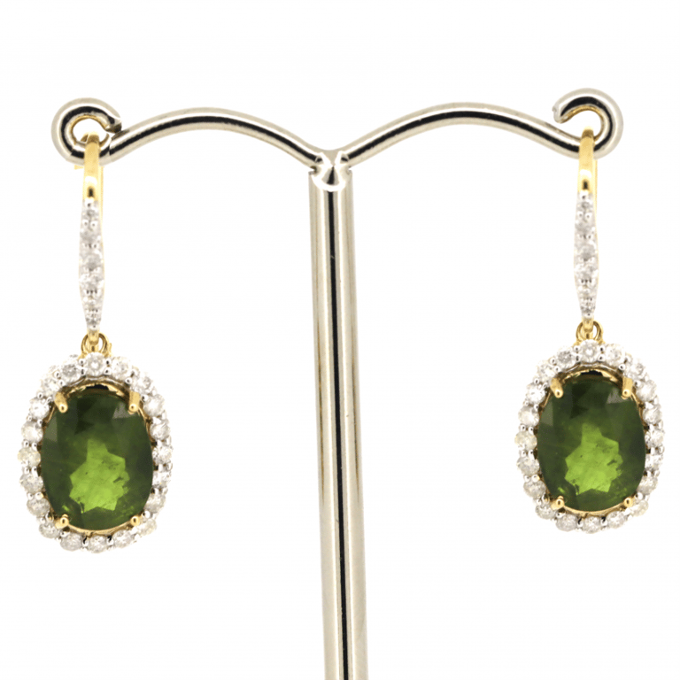 14K YELLOW GOLD, GREEN SAPPHIRE AND DIAMOND, HALO DROP EARRINGS. The Centres Feature, 2 Oval Faceted Cut, Deep Green, Sapphires (4.67Ct Tsw, Moderate Inclusions), Claw Set. Surrounding The Centres In Halos And Decorating The Drops Are, 52 Round Brilliant Cut, Diamonds (0.70Ct Tdw, H-J Colour, Si-12 Clarity), Bead Set In White Gold. The Earrings Have Shepherd Hooks. Valuations Provided by an Independent Third-Party Professional Not Directly Associated With Lloyds Auctions at AUD $$14,200.00This valuation has been conducted by an independent third-party professional. The valuation amount is an assessment by the issuing valuer and does not reflect the auction value of the item. Any inquiries regarding the valuation should be directed to the issuing valuer (refer to contact details on the certificate), as Lloyds Auctions has no affiliation or influence over the valuation, the valuer, or the stated amount. Condition: Good - Refer Images 0645847+81