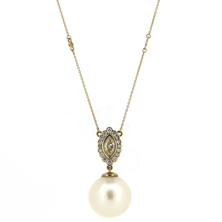 14K YELLOW GOLD, WHITE SOUTH SEA PEARL, LIGHT FANCY YELLOW DIAMOND AND DIAMOND, PENDANT NECKLACE. The Necklace Features, One Round, White South Sea Pearl (30.49Ct, Good Lustre, Medium Blemishes), Cap Set. Decorating The Bail Are, 22 Round Brilliant Cut, Diamonds (0.37Ct Tdw, H-I Colour, Si-I1 Clarity), In The Centre Are, One Round Brilliant Cut, Light Fancy Yellow (0.71Ct, Si2 Clarity), Bead Set. Valuations Provided by an Independent Third-Party Professional Not Directly Associated With Lloyds Auctions at AUD $$21,200.00This valuation has been conducted by an independent third-party professional. The valuation amount is an assessment by the issuing valuer and does not reflect the auction value of the item. Any inquiries regarding the valuation should be directed to the issuing valuer (refer to contact details on the certificate), as Lloyds Auctions has no affiliation or influence over the valuation, the valuer, or the stated amount. Condition: Good - Refer Images 0645847+6