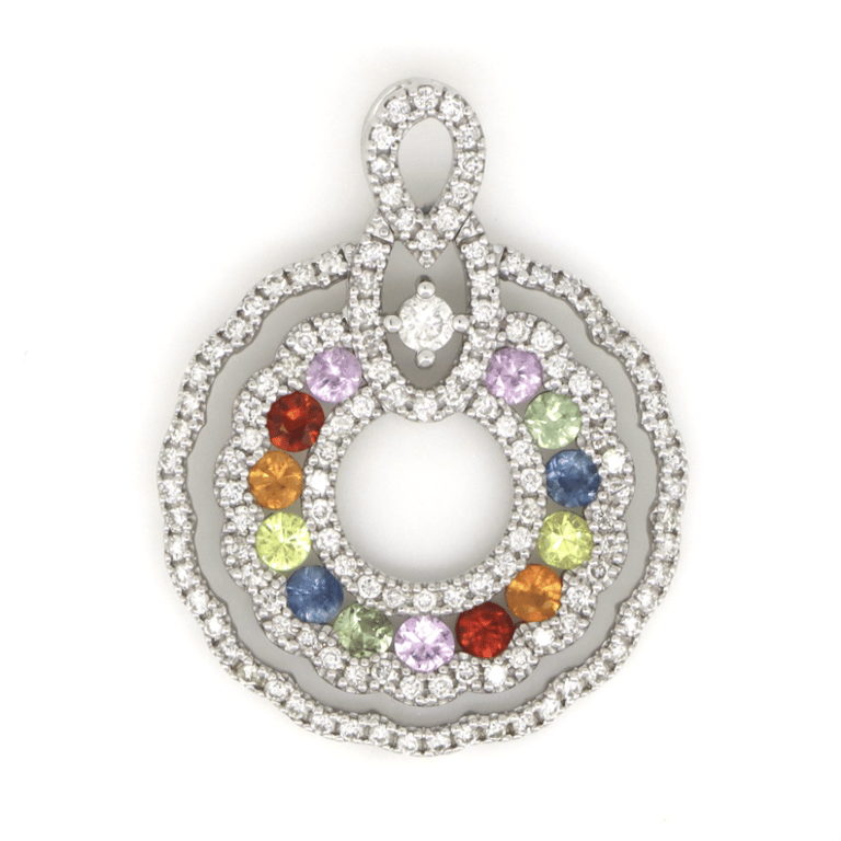 14K WHITE GOLD, MULTI-COLOURED SAPPHIRE AND DIAMOND, DECORATIVE PENDANT. The Design Features, 13 Round Faceted Cut, Pink, Green, Blue, Yellow, Orange And Red, Sapphires (0.77Ct Tsw, Eye Clean Clarity), 4 Claw Set. Surrounding The Central Design In Halos & Decorating The Pendant Are, 129 Round Brilliant Cut, Diamonds (0.57Ct Tdw, G-J Colour, Si-I2+ Clarity), Channel/Claw Set. Total Item Weight 3.1Grams. Valuations Provided by an Independent Third-Party Professional Not Directly Associated With Lloyds Auctions at AUD $$12,400.00This valuation has been conducted by an independent third-party professional. The valuation amount is an assessment by the issuing valuer and does not reflect the auction value of the item. Any inquiries regarding the valuation should be directed to the issuing valuer (refer to contact details on the certificate), as Lloyds Auctions has no affiliation or influence over the valuation, the valuer, or the stated amount. Condition: Good - Refer Images 0645847+45