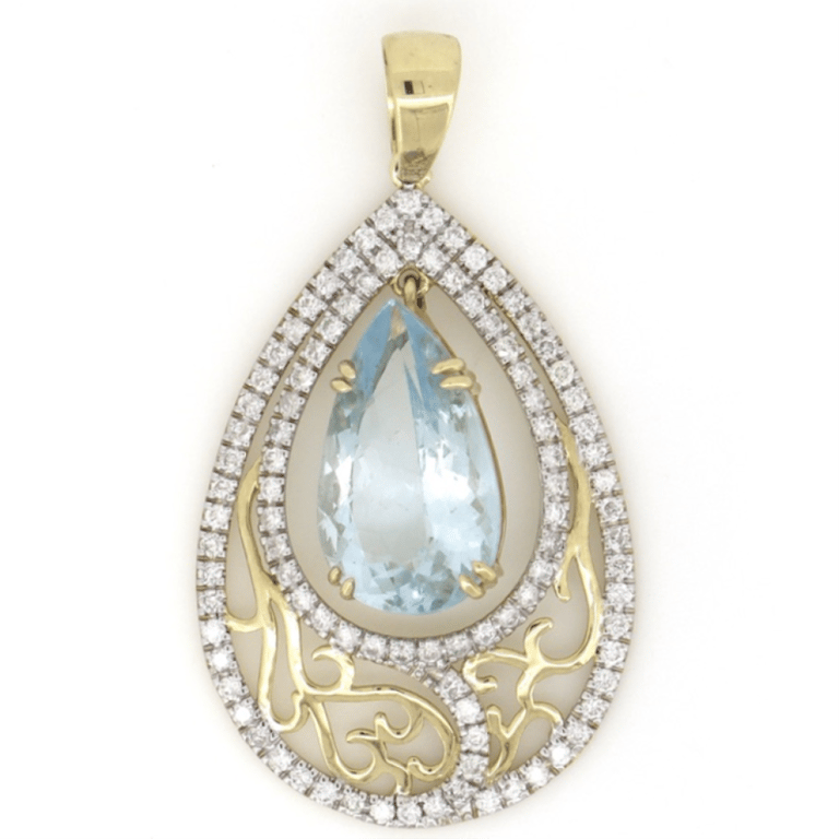 14K YELLOW GOLD, AQUAMARINE AND DIAMOND, DECORATIVE PENDANT. The Centre Features, One Pear Faceted Cut, Medium Blue, Aquamarine (5.35Ct, Slightly Included), Double 4 Claw Set. Encompassing The Design Are, 96 Round Brilliant Cut, Diamonds (0.87Ct Tdw, I-K Colour, Si2-P1 Clarity), Claw Set. Valuations Provided by an Independent Third-Party Professional Not Directly Associated With Lloyds Auctions at AUD $$13,210.00This valuation has been conducted by an independent third-party professional. The valuation amount is an assessment by the issuing valuer and does not reflect the auction value of the item. Any inquiries regarding the valuation should be directed to the issuing valuer (refer to contact details on the certificate), as Lloyds Auctions has no affiliation or influence over the valuation, the valuer, or the stated amount. Condition: Good - Refer Images 0645847+62