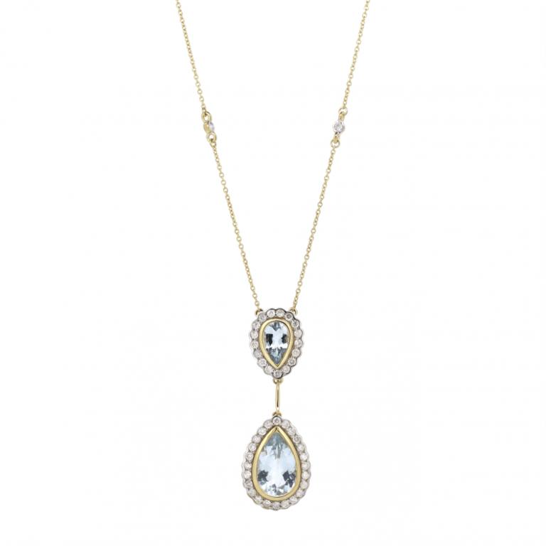 14K YELLOW/WHITE GOLD, AQUAMARINE AND DIAMOND, HALO DOUBLE DROP NECKLACE. The Pendant Features, 2 Pear Cut, Greyish-Blue, Aquamarines (2.59Ct Tsw, Minor Eye Visible Inclusions), Bezel Set. Surrounding The Centres In Halos Are, 41 Round Brilliant Cut, Diamonds (0.58Ct Tdw, J-K Colour, Si2-I2 Clarity), Semi-Bezel/Bead Set. Embellishing The Chain Are, 6 Round Brilliant Cut, Diamonds (0.09Ct Tdw, J-K Colour, Si2-I2 Clarity), Claw Set At Intervals. The Necklace Has A Lobster Claw Clasp. Necklace Length Is 48.6Cm. Valuations Provided by an Independent Third-Party Professional Not Directly Associated With Lloyds Auctions at AUD $$7,590.00This valuation has been conducted by an independent third-party professional. The valuation amount is an assessment by the issuing valuer and does not reflect the auction value of the item. Any inquiries regarding the valuation should be directed to the issuing valuer (refer to contact details on the certificate), as Lloyds Auctions has no affiliation or influence over the valuation, the valuer, or the stated amount. Condition: Good - Refer Images 0645847+83
