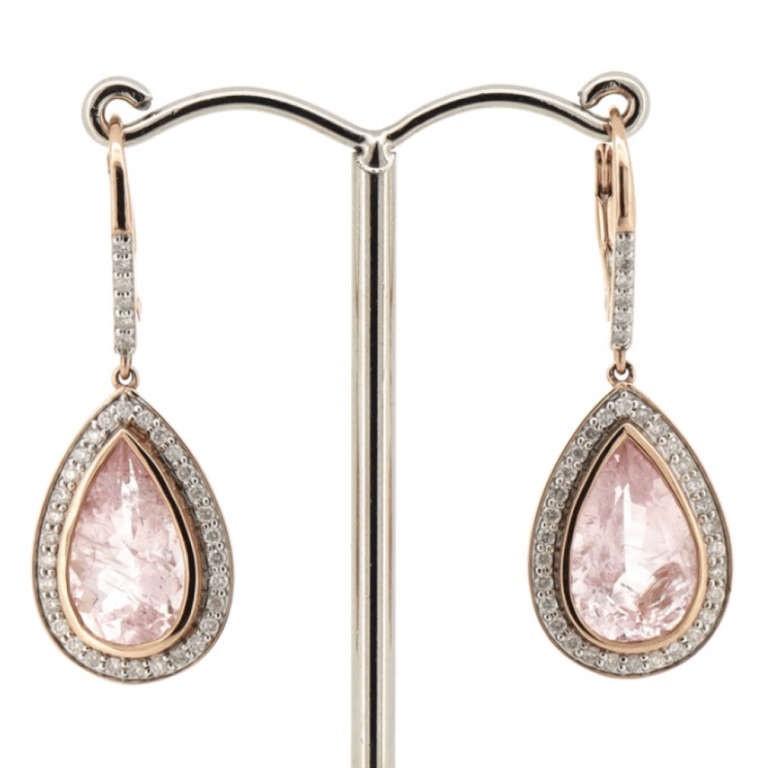 The Centres Feature, 2 Pear Cut, Medium Light Orangey-Pink, Morganites (6.94Ct Tsw, Moderate Eye Visible Inclusions), Bezel Set. Surrounding The Centres In Halos And Decorating The Hooks Are, 72 Round Brilliant Cut, Diamonds (0.57Ct Tdw, J-K Colour, Si2-I2 Clarity), Bead Set In White Gold. The Earrings Have Lever Back Closures.