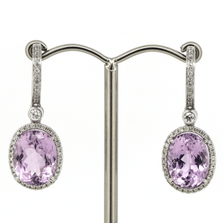 14K WHITE GOLD, KUNZITE AND DIAMOND, HALO DROP EARRINGS. The Drops Feature, 2 Oval Faceted Cut, Medium Deep Purplish-Pink, Kunzites (10.14Ct Tsw, Eye Clean-Minor Inclusions), Claw Set. Surrounding The Centres In Halos And Decorating The Hooks/Joins Are, 94 Round Brilliant Cut, Diamonds (0.58Ct Tdw, I-K Colour, P1-P3 Clarity), Claw/Bezel Set. The Earrings Have Latch Back Closures. Valuations Provided by an Independent Third-Party Professional Not Directly Associated With Lloyds Auctions at AUD $$14,550.00This valuation has been conducted by an independent third-party professional. The valuation amount is an assessment by the issuing valuer and does not reflect the auction value of the item. Any inquiries regarding the valuation should be directed to the issuing valuer (refer to contact details on the certificate), as Lloyds Auctions has no affiliation or influence over the valuation, the valuer, or the stated amount. Condition: Good - Refer Images 0645847+59