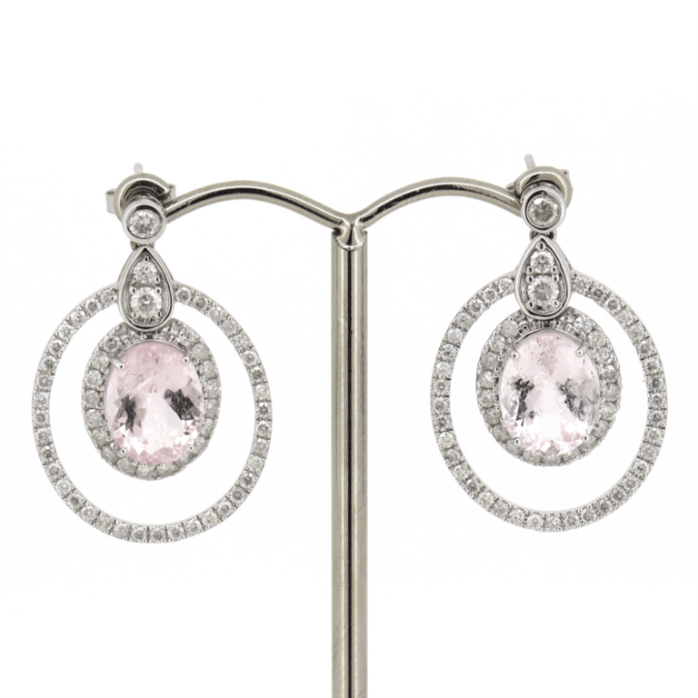 14K WHITE GOLD, MORGANITE AND DIAMOND, DOUBLE HALO EARRINGS. The Design Features, 2 Oval Cut, Light Pink, Morganite (5.58Ct Tsw, Moderate Inclusions), Bezel Set. Decorating The Studs & Surrounding The Centres In Halos Are, 118 Round Brilliant Cut, Diamonds (1.65Ct Tdw, H-I Colour, Si-I2 Clarity), Cutaway Claw/4 Claw Set. The Earrings Feature 14K White Gold Butterfly Clasps. Valuations Provided by an Independent Third-Party Professional Not Directly Associated With Lloyds Auctions at AUD $$15,200.00This valuation has been conducted by an independent third-party professional. The valuation amount is an assessment by the issuing valuer and does not reflect the auction value of the item. Any inquiries regarding the valuation should be directed to the issuing valuer (refer to contact details on the certificate), as Lloyds Auctions has no affiliation or influence over the valuation, the valuer, or the stated amount. Condition: Good - Refer Images 0645847+22