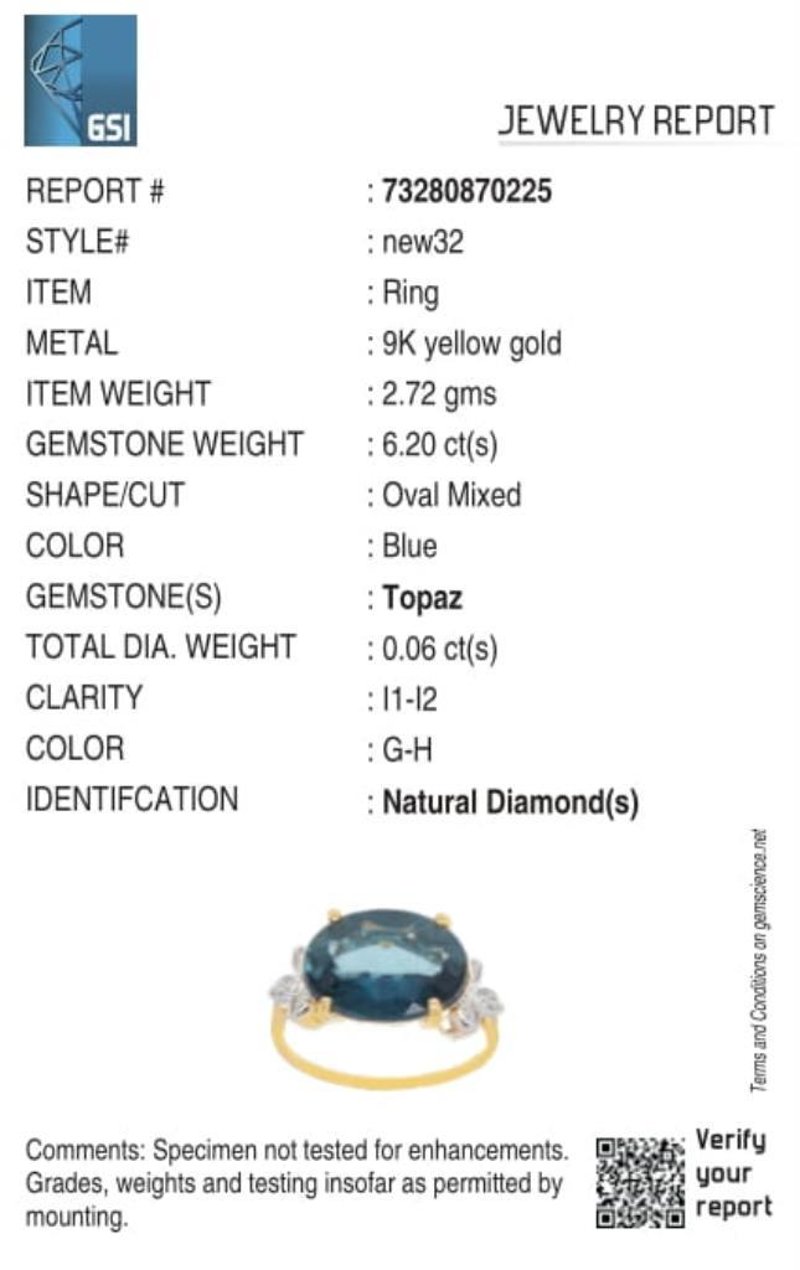 9CT YELLOW GOLD NATURAL LONDON BLUE TOPAZ & DIAMOND RING Weight Of The Item: 2.72 GFineness Of Metal(S): Yellow Gold 9KtThe Ring Consists Of (1) Oval Brilliant Natural London Blue Topaz. Surrounding The Main Stones Are Round Brilliant Cut Natural Diamonds.Identification: Natural London Blue TopazColor: BlueShape: Oval Brilliant CutNo. Of Stone: 1Dimension: 14 Mm X 10 Mm X 8.4 MmWeight: 6.2 CaratsCut: Very GoodIdentification: Natural DiamondShape: Round Brilliant CutWeight: 0.06 CtsCut: Excellent.Certificates Are Provided By Gemological Science International (Gsi), An Independent Third-Party Gemological Laboratory Based In The Usa And Recognised Among The Top 10 Gem Labs Globally Markings: 9ct Condition: Good - Refer Images 0488218+46