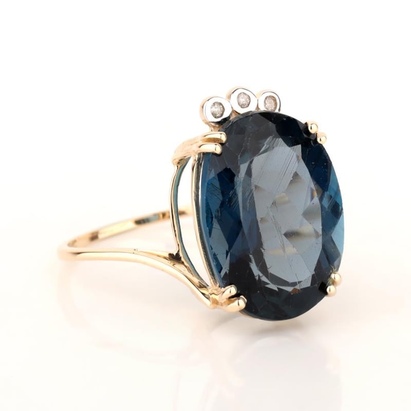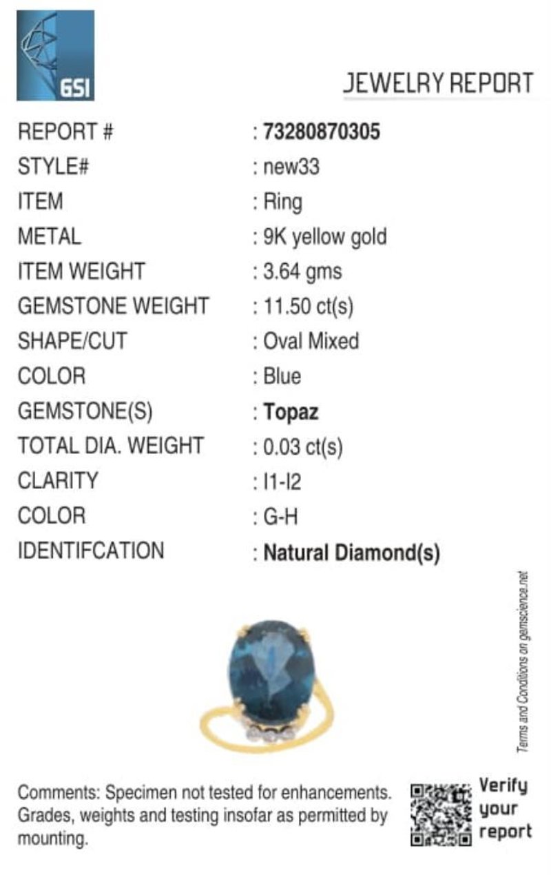 9CT YELLOW GOLD NATURAL LONDON BLUE TOPAZ & DIAMOND RING Weight Of The Item: 3.64 GFineness Of Metal(S): Yellow Gold 9KtThe Ring Consists Of (1) Oval Brilliant Natural London Blue Topaz. Surrounding The Main Stones Are Round Brilliant Cut Natural Diamonds.Identification: Natural London Blue TopazColor: BlueShape: Oval Brilliant CutNo. Of Stone: 1Dimension: 15 Mm X 11 Mm X 9 MmWeight: 11.5 CaratsCut: Very GoodIdentification: Natural DiamondShape: Round Brilliant CutWeight: 0.03 CtsCut: Excellent.Certificates Are Provided By Gemological Science International (Gsi), An Independent Third-Party Gemological Laboratory Based In The Usa And Recognised Among The Top 10 Gem Labs Globally Markings: 9ct Condition: Good - Refer Images 0488218+49