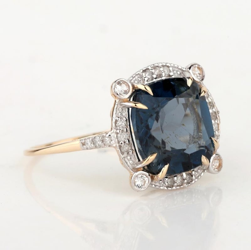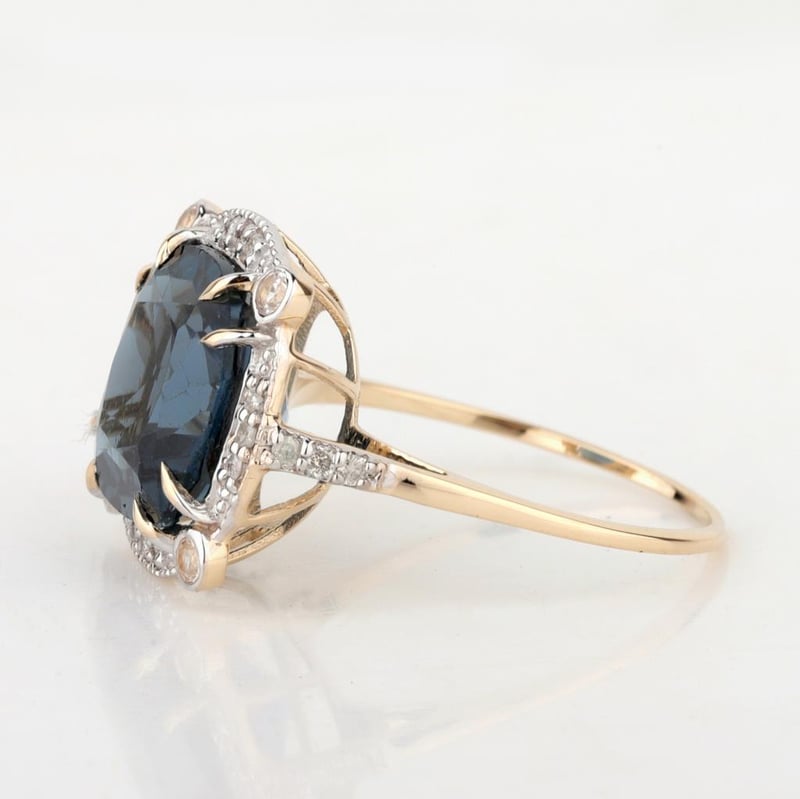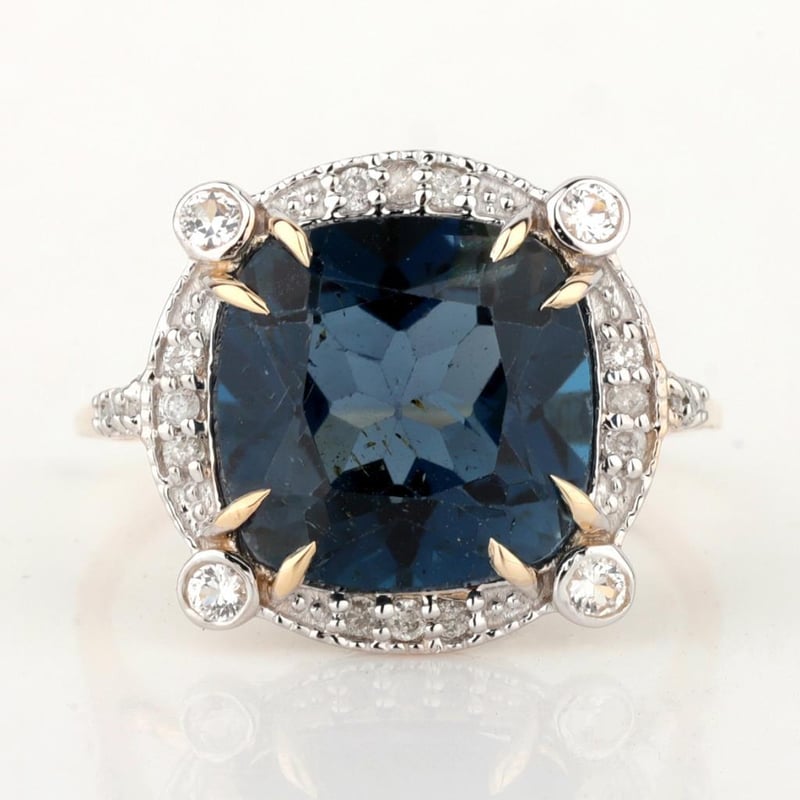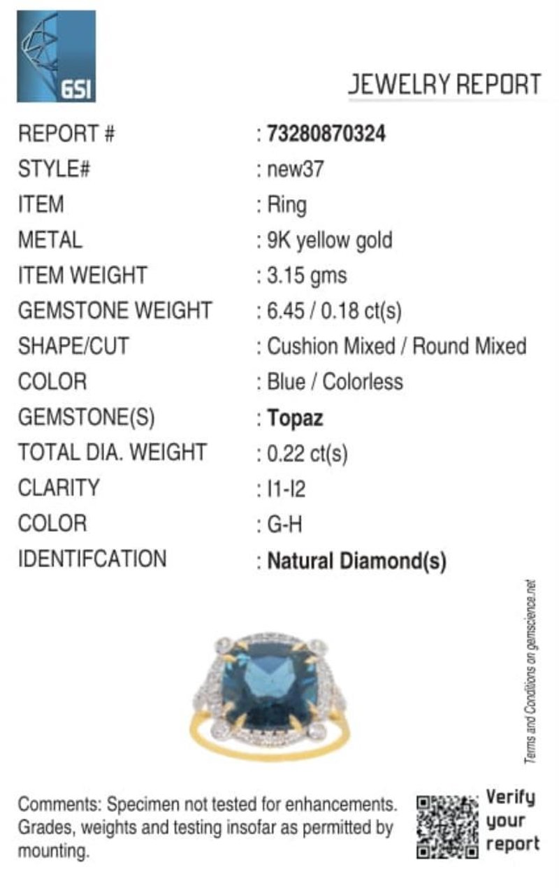 9CT YELLOW GOLD NATURAL LONDON BLUE TOPAZ & DIAMOND RING Weight Of The Item: 3.15 GFineness Of Metal(S): Yellow Gold 9KtThe Ring Consists Of (1) Cushion Brilliant Natural London Blue Topaz & (4) Round Brilliant Cut White Topaz. Surrounding The Main Stones Are Round Brilliant Cut Natural Diamonds.Identification: Natural London Blue Topaz / Natural White TopazColor: Blue / WhiteShape: Cushion Brilliant Cut / Round Faceted CutNo. Of Stone: 5Dimension: 11 Mm X 11 Mm X 6.6 MmWeight: 6.45 Carats / 0.18 CaratsCut: Very GoodIdentification: Natural DiamondShape: Round Brilliant CutWeight: 0.22 CtsCut: Excellent.Certificates Are Provided By Gemological Science International (Gsi), An Independent Third-Party Gemological Laboratory Based In The Usa And Recognised Among The Top 10 Gem Labs Globally Markings: 9ct Condition: Good - Refer Images 0488218+58