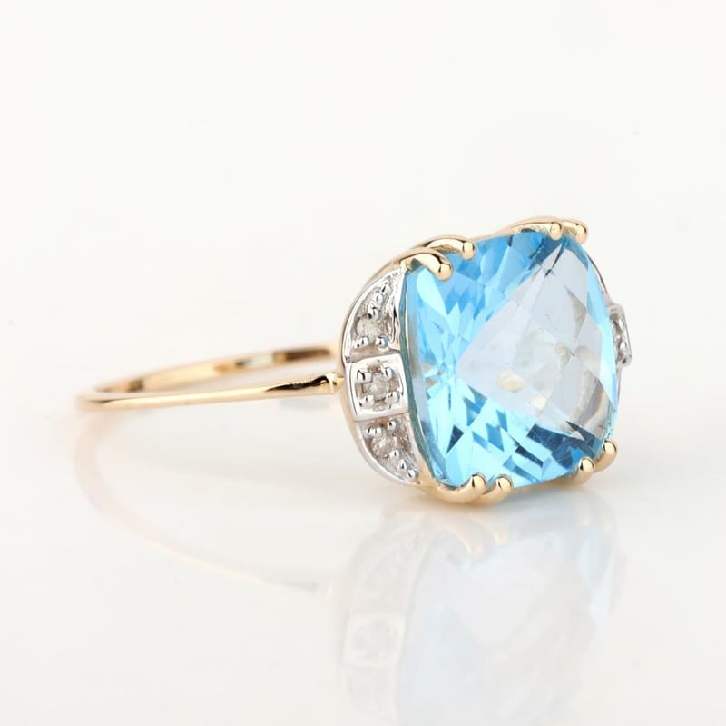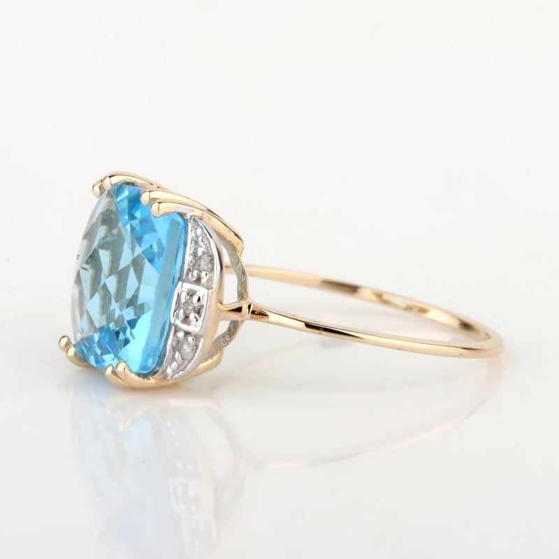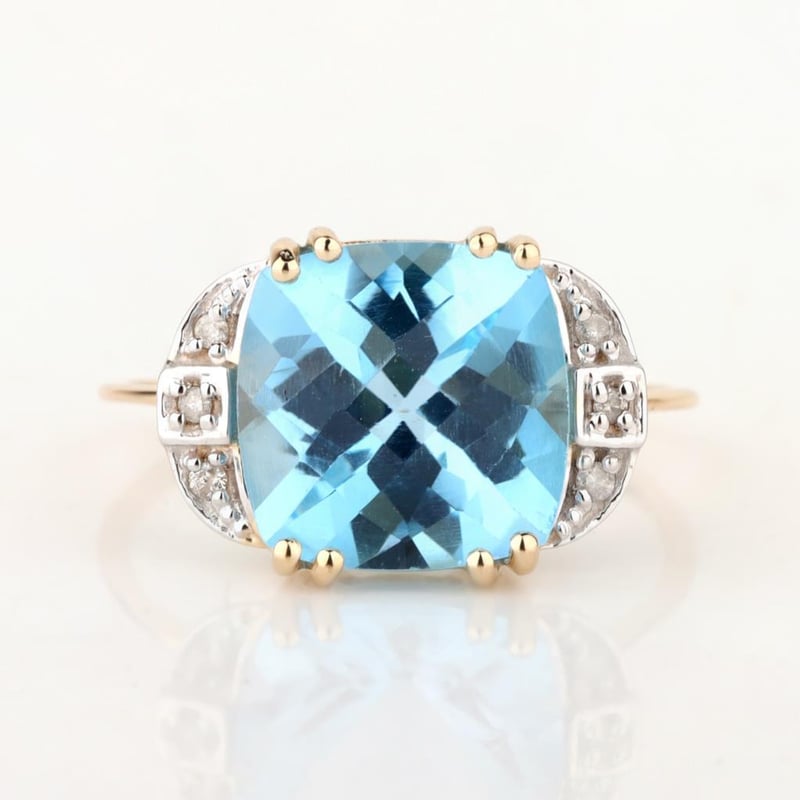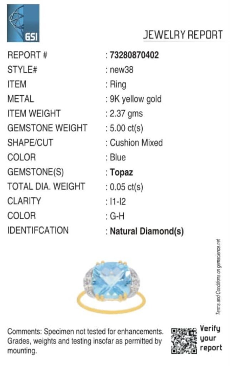 9CT YELLOW GOLD NATURAL SWISS BLUE TOPAZ & DIAMOND RING Weight Of The Item: 2.37 GFineness Of Metal(S): Yellow Gold 9KtThe Ring Consists Of (1) Cushion Brilliant Natural Swiss Blue Topaz. Surrounding The Main Stones Are Round Brilliant Cut Natural Diamonds.Identification: Natural Swiss Blue TopazColor: BlueShape: Cushion Brilliant CutNo. Of Stone: 1Dimension: 10 Mm X 10 Mm X 6 MmWeight: 5 CaratsCut: Very GoodIdentification: Natural DiamondShape: Round Brilliant CutWeight: 0.05 CtsCut: Excellent.Certificates Are Provided By Gemological Science International (Gsi), An Independent Third-Party Gemological Laboratory Based In The Usa And Recognised Among The Top 10 Gem Labs Globally Markings: 9ct Condition: Good - Refer Images 0488218+60