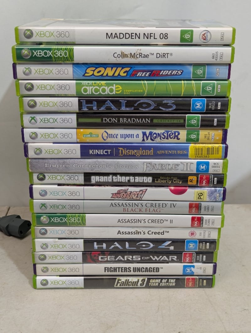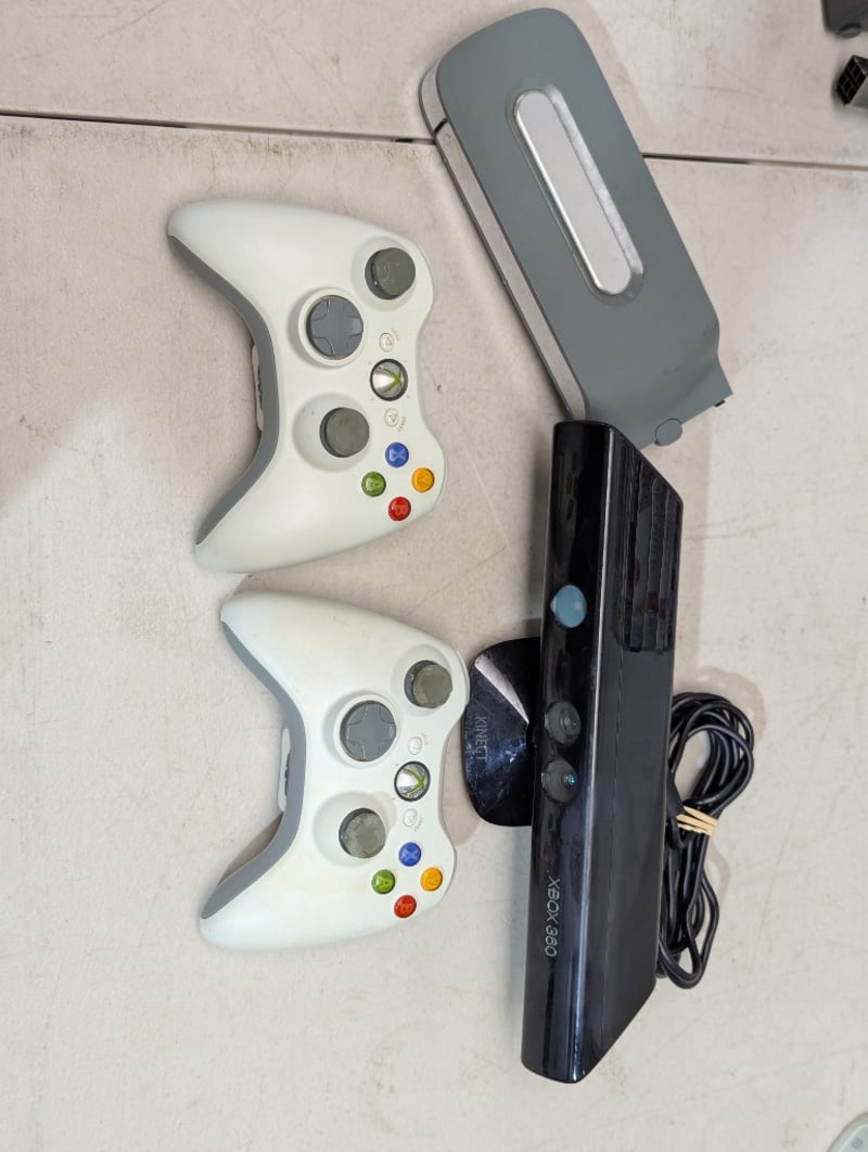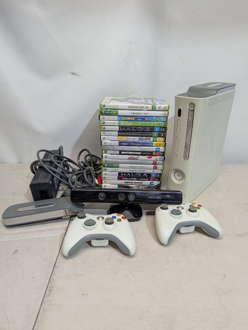 Xbox 360 gaming system with Kinect camera, extra hard drive, 2 controllers and assorted games Games include Grand Theft Auto Liberty City, Assassin's Creed, Halo 3 and moreSOLD AS LOT