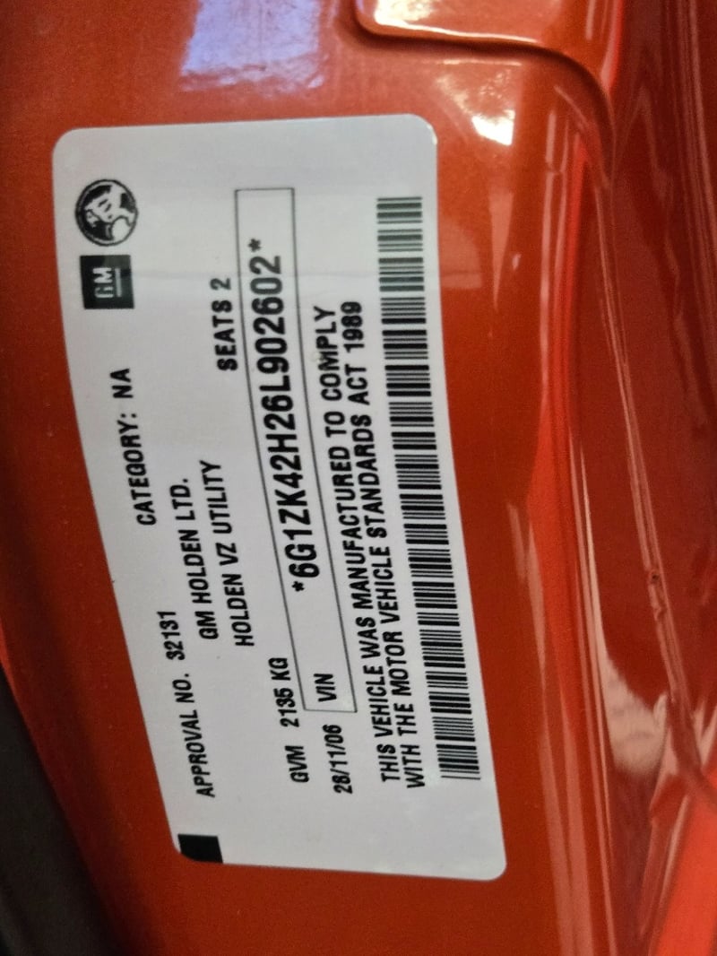 2006 Holden Ute VZ SS ThunderYear: 2006Make: HoldenModel: UteSeries: VZBadge: SS Thunder Body: Single Cab UtilityDrive Type: Rear wheel driveOdometer: Indicating 156,451 KilometersEngine: 6.0 V8 PetrolTransmission: 6-Speed ManualColour: OrangeSeats: 2Description/extras: Owners manual. VIN: 6G1ZK42H26L902602ENG No: CAK062480142(Key #C40)Lloyds stock #990706+1#CCALL#CCAUS