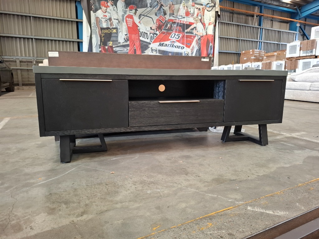 RRP $1,599.00 VI Maze Concrete Top Solid Timber 2 Door 1 Drawer Entertainment Unit NOTE: DAMAGE VISIBLE - SIDE OF UNIT, PLEASE SEE IMAGES Dimension: W180 x D45 x H60 CM Modern 2 - tone contemporary look with Concrete Tops & Metal Legs Constructed in Acacia timber with a concrete top and silver metal bar handles Drawers have full extension metal runners and doors are on soft close hinges Assembly required to install the legs only Colour: Grey Top; Sand Black Legs; Brushed Black Acacia and Silver Handles