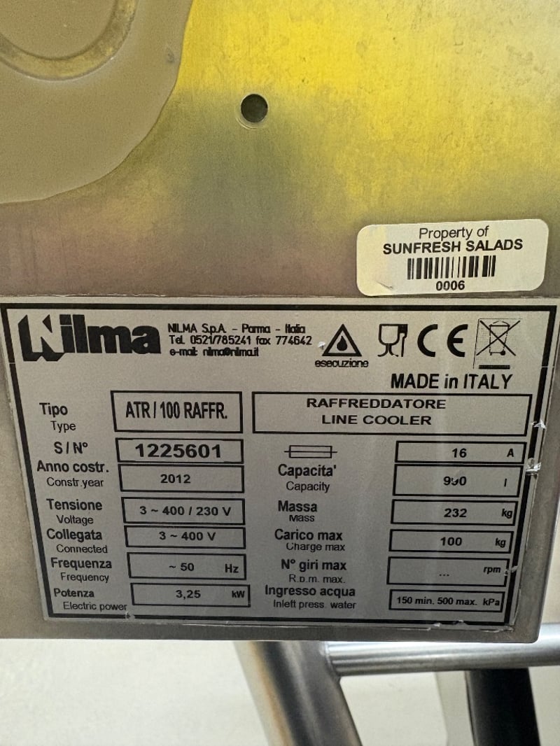 Refrigerated Line Cooler, Nilma ATR-100 Refrigerated Line Cooler (2012) Type: ATR-100 / Raffr Serial No.: 1225601 Year: 2012 ________________________________________ Description & Key Features • Industrial / food-processing refrigerated line cooler (product cooling / chilling in a continuous processing line) • Designed to cool liquids / semi-fluids (e.g. sauces, soups) via a chilled fluid or refrigerant circulation through the cooler surface • Stainless steel / sanitary construction in fluid contact areas • Integrated or external refrigeration loop (compressor / evaporator / condenser) or chilled fluid connection • Temperature control, flow regulation, insulation, drainage and sanitation features W 240cm D 130cm H 175cm Location: Mawson Lakes, South Australia Contact: Gage Mackay - 0458 732 549 or [email protected] Inspection: Wednesday 12th, 9am - 1pm ** Important Notice to Buyers ** Customers MUST sign in on site for inspections and collections Site safety gear is mandatory for all visitors: this includes a high-visibility top, and steel cap boots. The buyer is fully responsible for the dismantling and decommissioning of any electrical, plumbing and gas components. This work must be carried out by a qualified tradesperson. Buyers must provide their own tools, labor, lifting equipment, and transport to ensure the safe removal of the asset. If required, the buyer must organize a crane or Franna at their own expense. All contractors must carry current insurance and comply with Occupational Health and Safety (OHS) regulations. After asset removal, the site must be left clean and tidy. Inspection is highly recommended prior to purchase and removal.