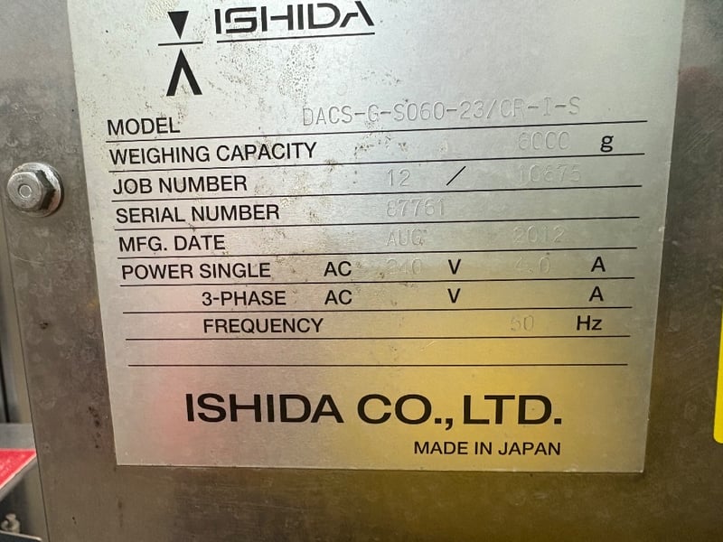 Check Weigher Ishida Check Weigher – DACS-G-S060-23/CR-I-S (Dual Conveyors + Perspex Cover) Make / Model: Ishida DACS-G-S060-23/CR-I-S Serial Number: 87761 Configuration: Dual conveyors, total width ~120 cm, with perspex cover / enclosur Key Features & Highlights • Ishida DACS-G series quality control checkweigher (mid-range, S060 class) • Dual-lane conveyor configuration (combined ~120 cm width) for high throughput or multi-lane packaging • Perspex cover / enclosure over weighing area for dust / contamination protection • Hygienic stainless steel frame, open design for cleaning • Tool-less belt removal, modular construction • Supports various reject mechanisms (air jet, pusher, etc.) • Integrated data export (USB / Ethernet / serial) for reporting • Adjustable belt height to align with upstream / downstream equipment • Overload protection (DFL — Dislocation Force Limiter) to protect load cell Location: Mawson Lakes, South Australia Contact: Gage Mackay - 0458 732 549 or [email protected] Inspection: Wednesday 12th, 9am - 1pm ** Important Notice to Buyers ** Customers MUST sign in on site for inspections and collections Site safety gear is mandatory for all visitors: this includes a high-visibility top, and steel cap boots. The buyer is fully responsible for the dismantling and decommissioning of any electrical, plumbing and gas components. This work must be carried out by a qualified tradesperson. Buyers must provide their own tools, labor, lifting equipment, and transport to ensure the safe removal of the asset. If required, the buyer must organize a crane or Franna at their own expense. All contractors must carry current insurance and comply with Occupational Health and Safety (OHS) regulations. After asset removal, the site must be left clean and tidy. Inspection is highly recommended prior to purchase and removal.