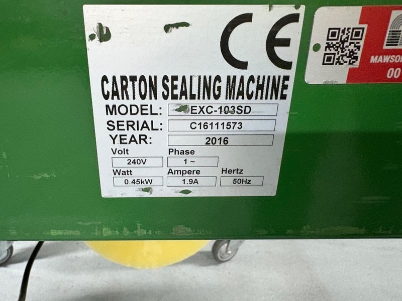 Carton Sealing Machine – 2016 EXC103SD Automatic Carton Sealer Make / Model: EXC103SD Serial Number: C16111573 Year: 2016 Type: Automatic carton sealing machine Description Heavy-duty automatic carton sealer designed for efficient and consistent sealing of cardboard boxes using adhesive tape. Ideal for production and packaging lines, providing uniform sealing of top and bottom flaps. Constructed in durable steel with easy operation and adjustable settings for various carton sizes. Key Features • Automatic top and bottom sealing for uniform, professional results. • Adjustable conveyor height and width for multiple carton sizes. • Twin side drive belts for stable carton transfer. • Top and bottom tape heads for consistent tape application. • Quick and easy tape roll changes. • Rugged steel frame with locking casters for mobility. • Simple operator controls with emergency stop. • Low-maintenance design suitable for continuous operation. Sealing Speed: Up to 20 cartons per minute (depending on size and tape type) Tape Width: 48–72 mm compatible Power Supply: 240V / 50 Hz / Single Phase W 130cm D 90cm H 150cm Location: Mawson Lakes, South Australia Contact: Gage Mackay - 0458 732 549 or [email protected] Inspection: Wednesday 12th, 9am - 1pm ** Important Notice to Buyers ** Customers MUST sign in on site for inspections and collections Site safety gear is mandatory for all visitors: this includes a high-visibility top, and steel cap boots. The buyer is fully responsible for the dismantling and decommissioning of any electrical, plumbing and gas components. This work must be carried out by a qualified tradesperson. Buyers must provide their own tools, labor, lifting equipment, and transport to ensure the safe removal of the asset. If required, the buyer must organize a crane or Franna at their own expense. All contractors must carry current insurance and comply with Occupational Health and Safety (OHS) regulations. After asset removal, the site must be left clean and tidy. Inspection is highly recommended prior to purchase and removal.