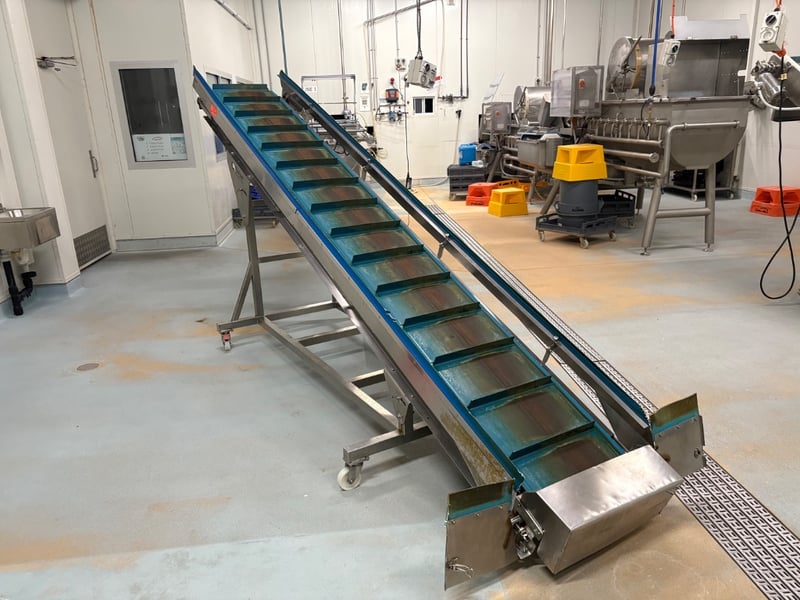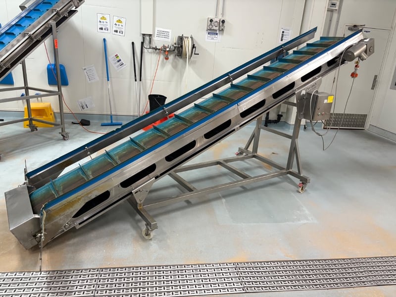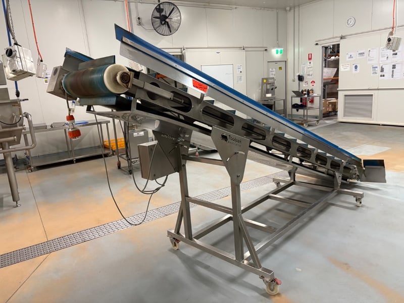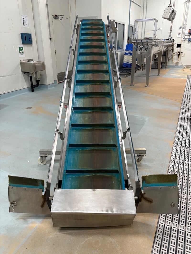 Conveyor – Toolpak Cleated Incline Food Conveyor (250 cm to 200 cm Incline) Make / Model: Toolpak Type: Cleated incline food-grade conveyor Power Supply: 415V / 3 Phase / Description Food-grade cleated incline conveyor manufactured by Toolpak, designed for hygienic transfer of washed or prepared produce between processing stages. Constructed from stainless steel with a modular blue cleated belt, this conveyor provides secure product movement on an incline and is ideal for integration with vegetable washlines, slicers, and packing systems. Key Features • Blue modular cleated belt for reliable incline transfer of wet or loose produce. • Stainless-steel frame and side panels for durability and hygiene. • Gentle incline from 250 cm length to 200 cm height. • Adjustable belt speed for precise product control. • Mobile frame with lockable castors for flexible use. • Quick-release belt for fast cleaning and inspection. • IP-rated motor suitable for washdown environments. • Designed for continuous operation in food production areas. D 390cm W 120cm H 190cm Location: Mawson Lakes, South Australia Contact: Gage Mackay - 0458 732 549 or [email protected] ** Important Notice to Buyers ** Customers MUST sign in on site for inspections and collections Site safety gear is mandatory for all visitors: this includes a high-visibility top, and steel cap boots. The buyer is fully responsible for the dismantling and decommissioning of any electrical, plumbing and gas components. This work must be carried out by a qualified tradesperson. Buyers must provide their own tools, labor, lifting equipment, and transport to ensure the safe removal of the asset. If required, the buyer must organize a crane or Franna at their own expense. All contractors must carry current insurance and comply with Occupational Health and Safety (OHS) regulations. After asset removal, the site must be left clean and tidy. Inspection is highly recommended prior to purchase and removal.