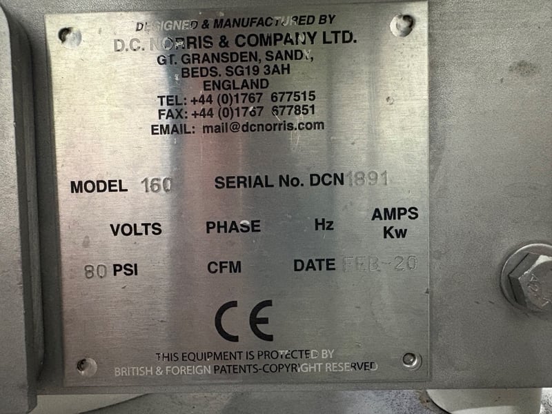 Heavy-duty air-operated can opener manufactured by DC Norris & Company, UK — designed for rapid and hygienic opening of large industrial food cans.