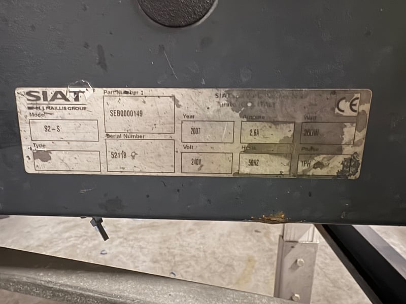 Carton Sealer, Siat Carton Sealer, 240V, Model: S2-S SN: 52118, P/N: SEB0000149, MY: 2007, D 150cm W 80cm H 170cm Location: Mawson Lakes, South Australia Contact: Gage Mackay - 0458 732 549 or [email protected] ** Important Notice to Buyers ** Customers MUST sign in on site for inspections and collections Site safety gear is mandatory for all visitors: this includes a high-visibility top, and steel cap boots. The buyer is fully responsible for the dismantling and decommissioning of any electrical, plumbing and gas components. This work must be carried out by a qualified tradesperson. Buyers must provide their own tools, labor, lifting equipment, and transport to ensure the safe removal of the asset. If required, the buyer must organize a crane or Franna at their own expense. All contractors must carry current insurance and comply with Occupational Health and Safety (OHS) regulations. After asset removal, the site must be left clean and tidy. Inspection is highly recommended prior to purchase and removal.
