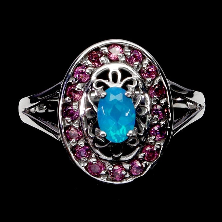 NATURAL BLUE OPAL & GARNET RING. Natural Blue Opal & Garnet Ring. Made In Solid Sterling Silver And Plated In14K White Gold. Featurees Natural Blue Opal And Natural Rhodolite Garnet. Ring Size 9 Condition: Good - Refer Images 0488279+10