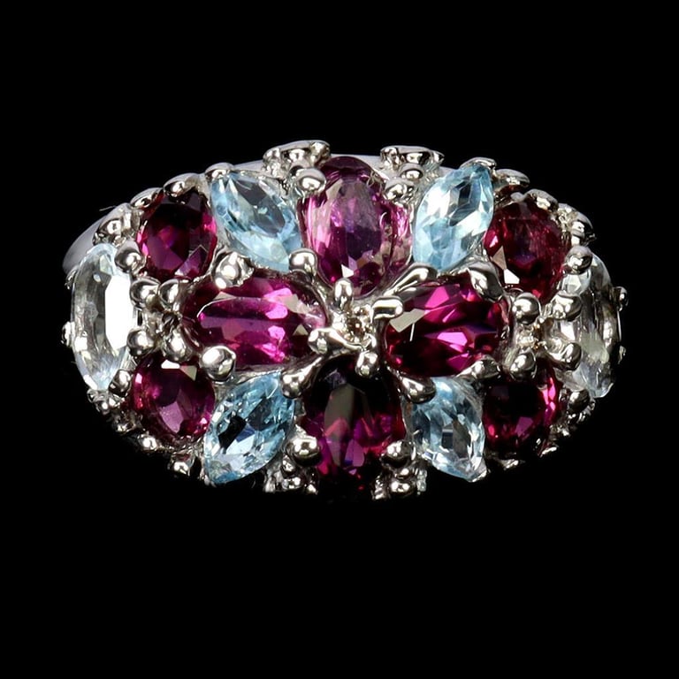 NATURAL GARENT & TOPAZ RING. Natural Garent & Topaz Ring. Made In Solid Sterling Silver And Plated In14K White Gold. Features Natural Rhodolite Garnets And Natural Sky Blue Topaz. Ring Size 7 Condition: Good - Refer Images 0488279+16