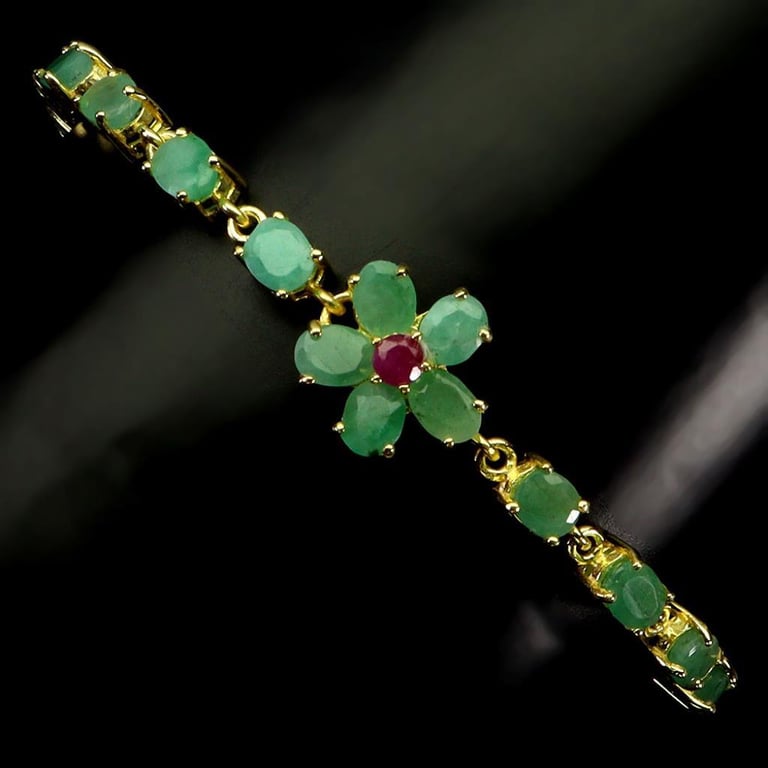 NATURAL RUBY & EMERALD TENNIS BRACELET. Natural Ruby & Emerald Tennis Bracelet. Made In Solid Sterling Silver And Plated In 14K Yellow Gold. Feayures Natural Red Ruby And Natural Green Emeralds. Tennis Bracelet Measures 8 Inches. Condition: Good - Refer Images 0488279+11