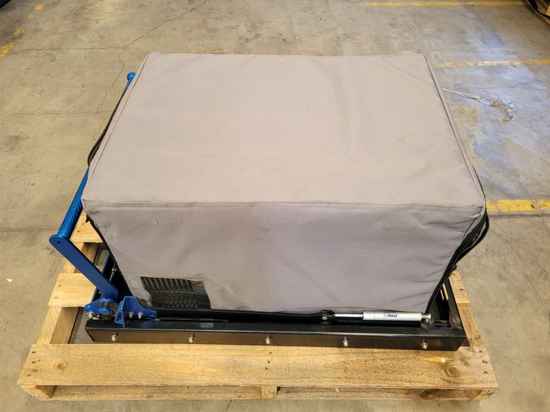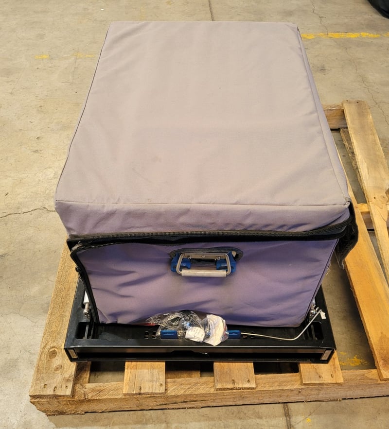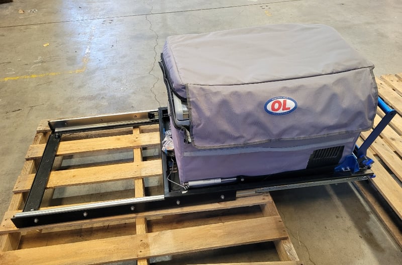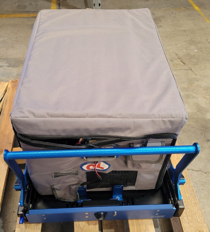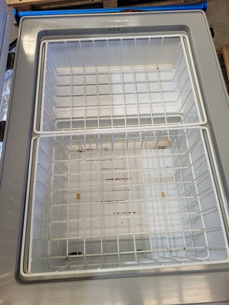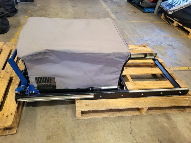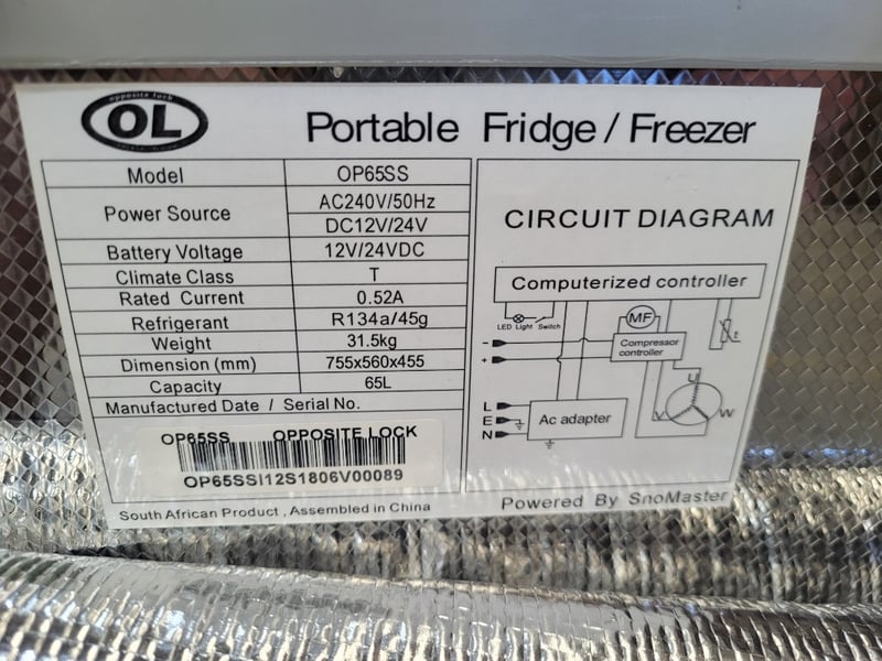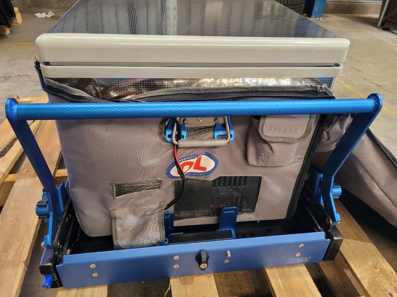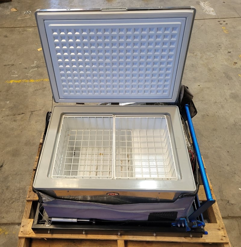 Portable Fridge/Freezer On a Slide Frame.Description: Model: OP6566, power source: DC 12V/24V, weight: 31.5kg, dimensions: 755x560x455, capacity 65L, on MSA fridge slide frame.Note: Minor wear, untested.