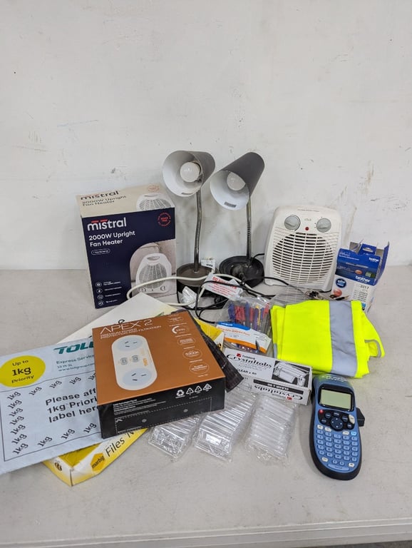 Assorted office supplies, including fan heaters, desk lamps, suspension file tabs, dymo label printer and more SOLD AS LOT