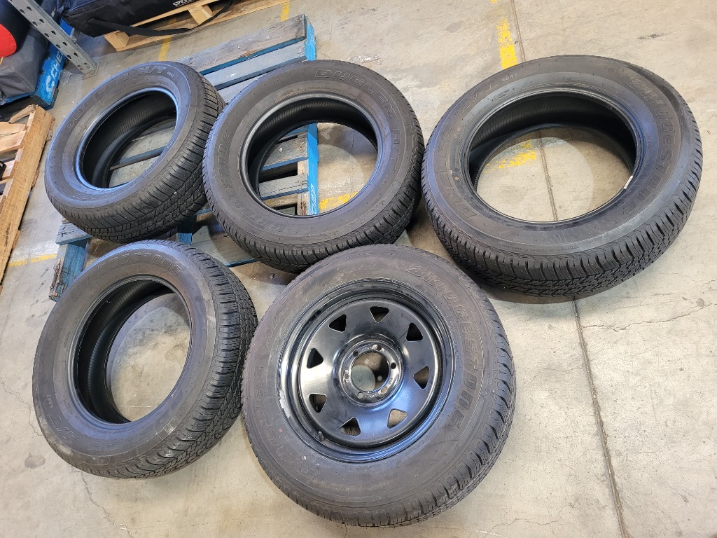 X4 Bridgestone Tyres and X1 Full WheelDescription: x4 Bridgestone Dueller H/T, 265/60R18 Tyres, X1 full wheel. In good condition.
