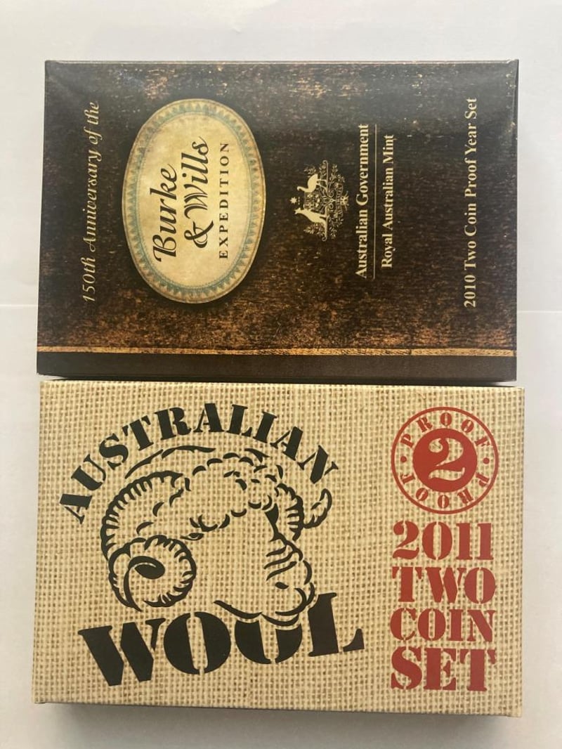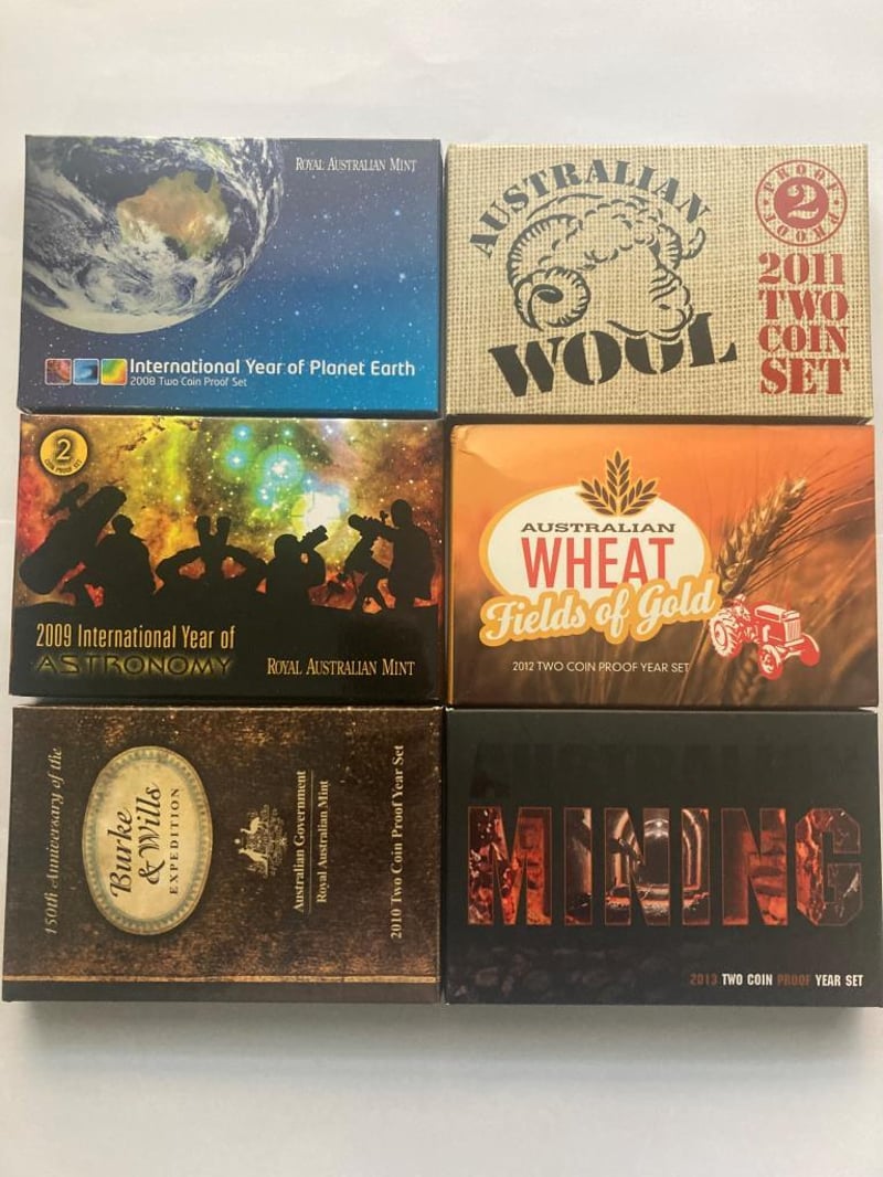 2008-2013 RAM TWO COIN PROOF SETS X 8 COMPRISING, 2008 INTERNATIONAL YEAR OF PLANET EARTH, 2009 INTERNATIONAL YEAR OF ASTRONOMY, 2010 BURKE & WILLS EXPEDITION, 2011 AUSTRALIAN WOOL, 2012, AUSTRALIAN WHEAT, 2013 AUSTRALIAN MINING 488248+7