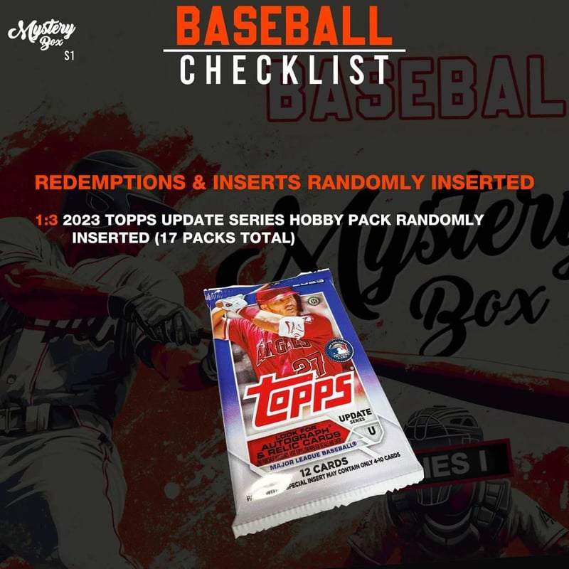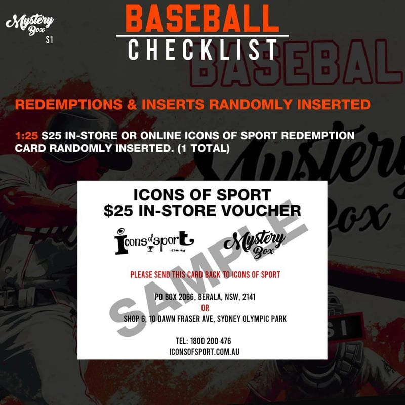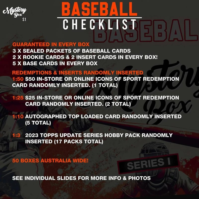 BASEBALL TRADING CARD MYSTERY BOX SERIES 1OverviewLimited Edition Of Only 50 Mystery Boxes Australia Wide!The Best Value Baseball Mystery Box On The Market!Guaranteed Inclusions In Every Box3 X Sealed Packets Of Baseball Cards2 X Rookie Cards & 2 X Insert Cards5 X Base CardsPlus Random Inserts & Redemptions1:50 $50 In-Store Or Online Icons Of Sport Redemption Card Randomly Inserted (1 Total)1:25 $25 In-Store Or Online Icons Of Sport Redemption Card Randomly Inserted (2 Total)1:10 Autographed Top Loaded Card Randomly Inserted (5 Total)1:3 2023 Topps Update Series Hobby Pack Randomly Inserted (17 Packs Total)Each Box Comes Sealed With A Golden Icons Of Sport Sticker And Is Covered In A Paper Sleeve.Condition: Good - Refer To Images488292+33468