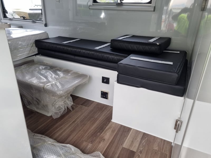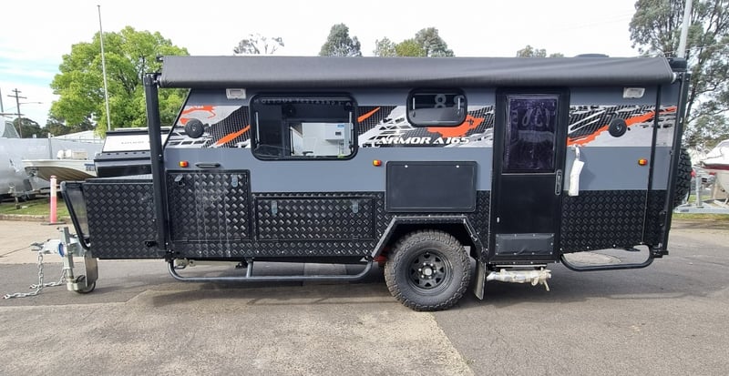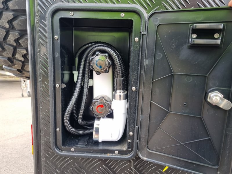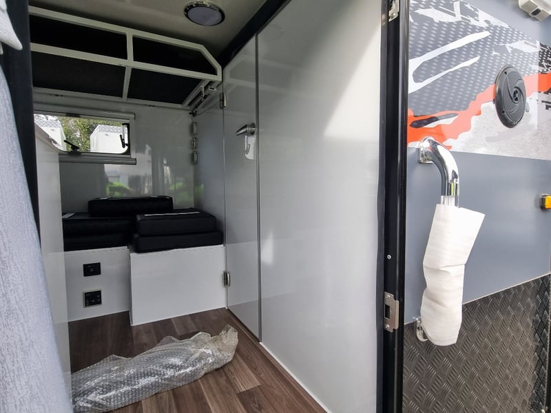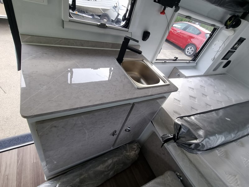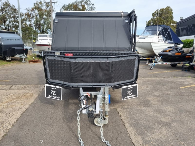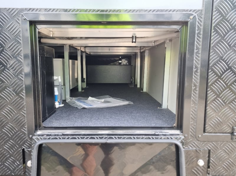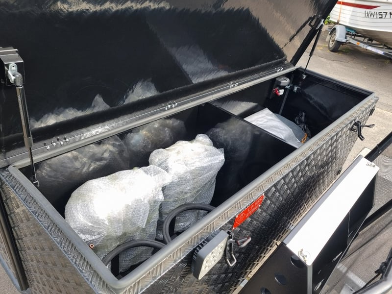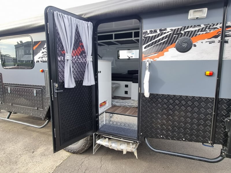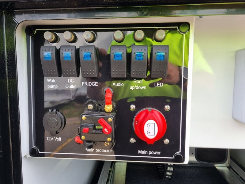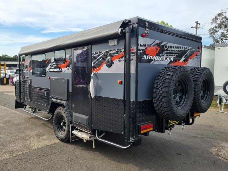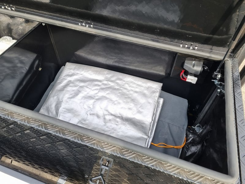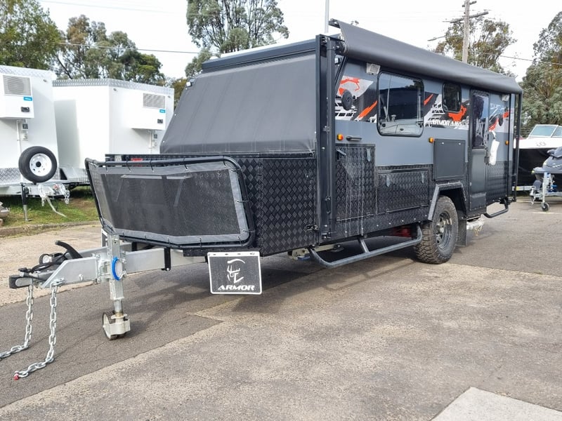 Finish: Hot-Dip Galvanized steel frame, Jockey Wheel: Heavy duty steel, Includes: 2 x Jerry can holders, Water tank: 180 L, Waste water tank: 120L, 2 x Gas bottle holders (9 KG bottles), Bedding area: LED Lights with Switch, Lights: Built-in LED Lights (internal & external), Solar Panel: 200W Roof mounted solar panel, Electric: 2000w inverter, 30A charger .240v inlet and Australian standard wires, air condition, truma water heater, Stabilizer legs: 4 x quick lock-up and wind down drop-down stabilizer legs, tent