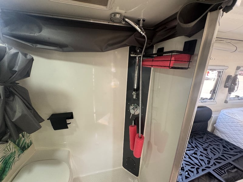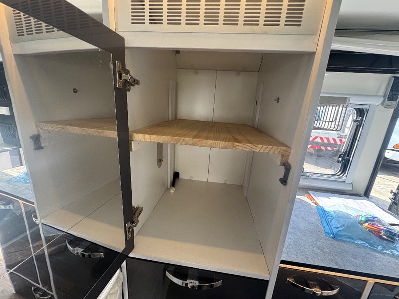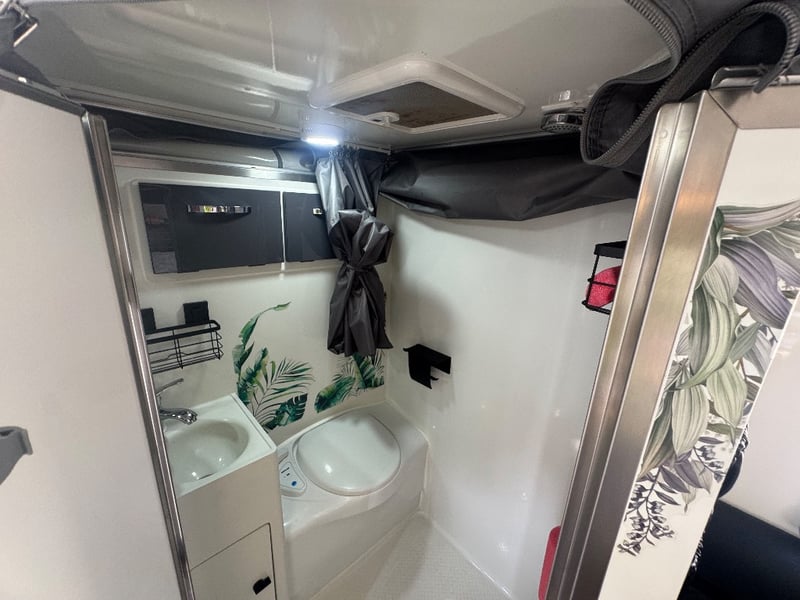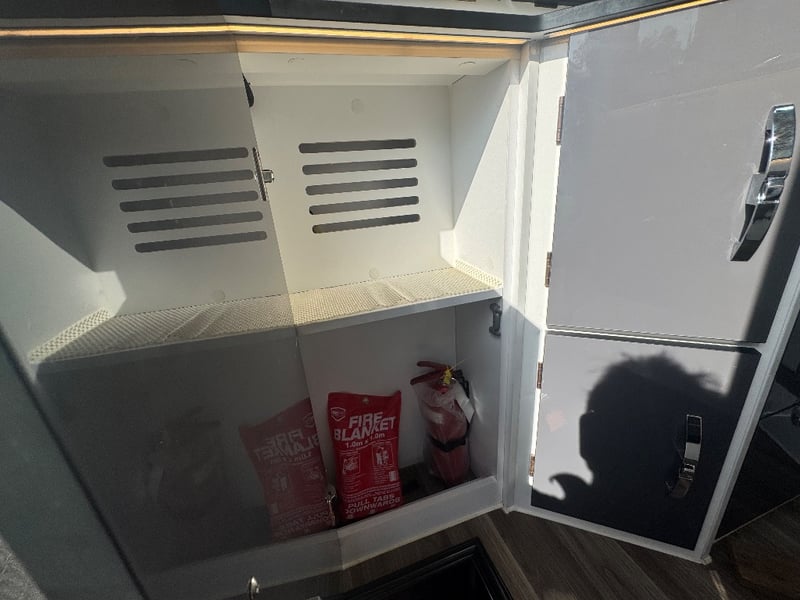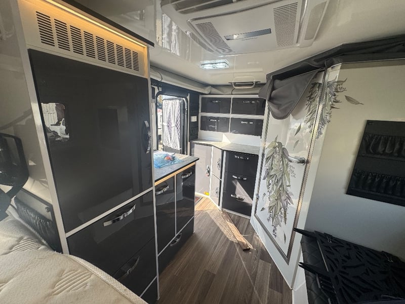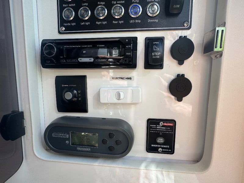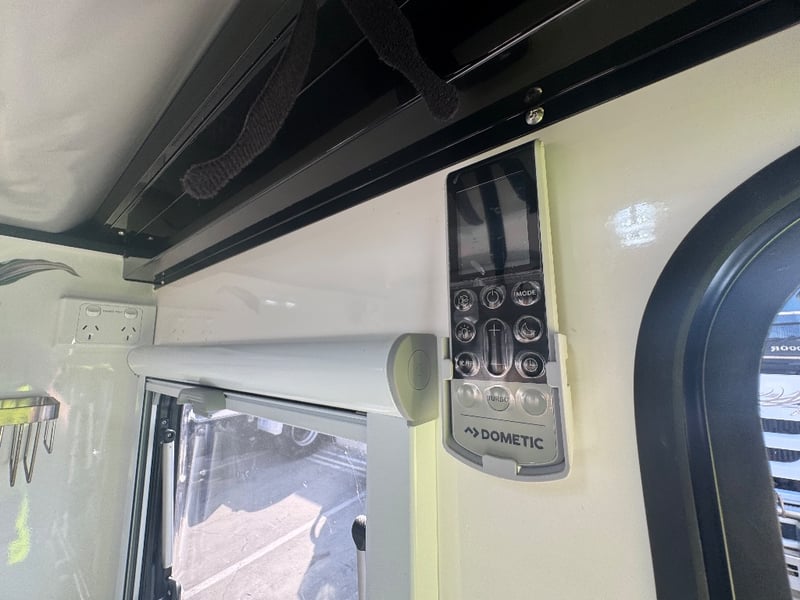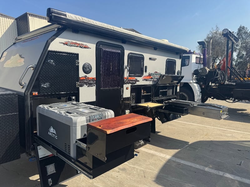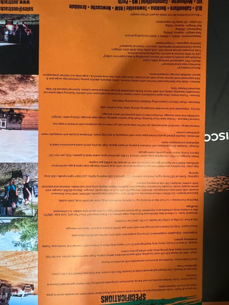 Description/ extras: Multiple exterior storage, outside speakers, outdoor power point, 2 spare tyres, electric side awning, water heater, 7 pin connector, electric assist entry step, aircon, shower toilet, sink, fire extinguisher, ambient lighting, stereo system. Pullout Kitchen, Fans, Tv