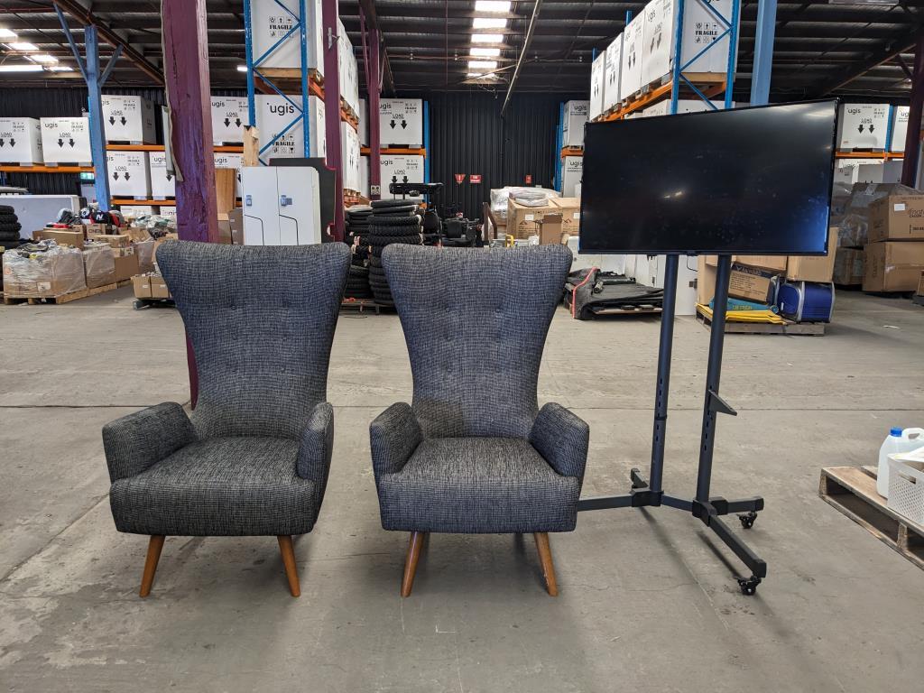 Office Furniture lot, include upholstered high-back chair with wooden legs, and TV Monitor on stand with castors. Dims of high-back chairs: H:117 x L:77 x D:70 Dims of TV Monitor: H: 170 x L:88 x D:74 Sold as lot.