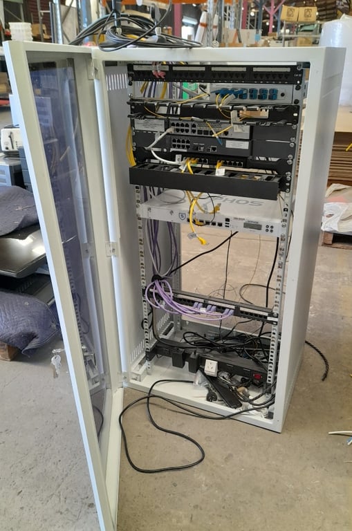 Network Cabinet - B&R, beige steel, wall mounted, 24U, enclosed, installed with 2x 24-port patch panels, 2x coaxial patch panels, 2x cable management panels, 2x Huawei switches