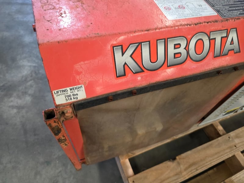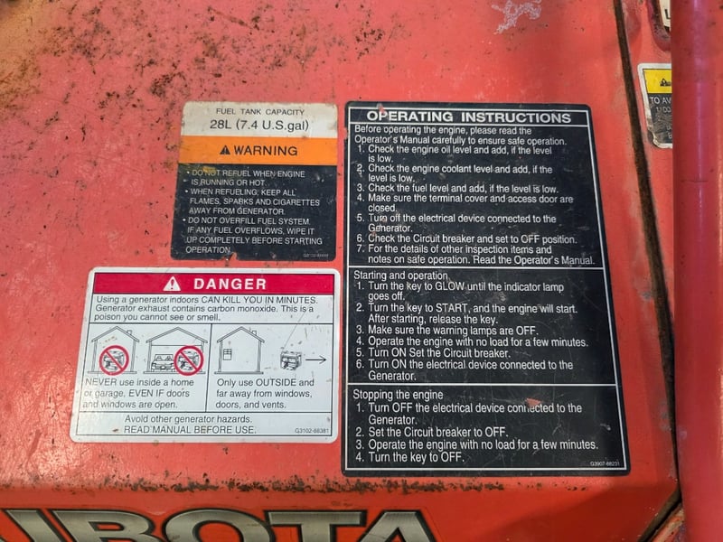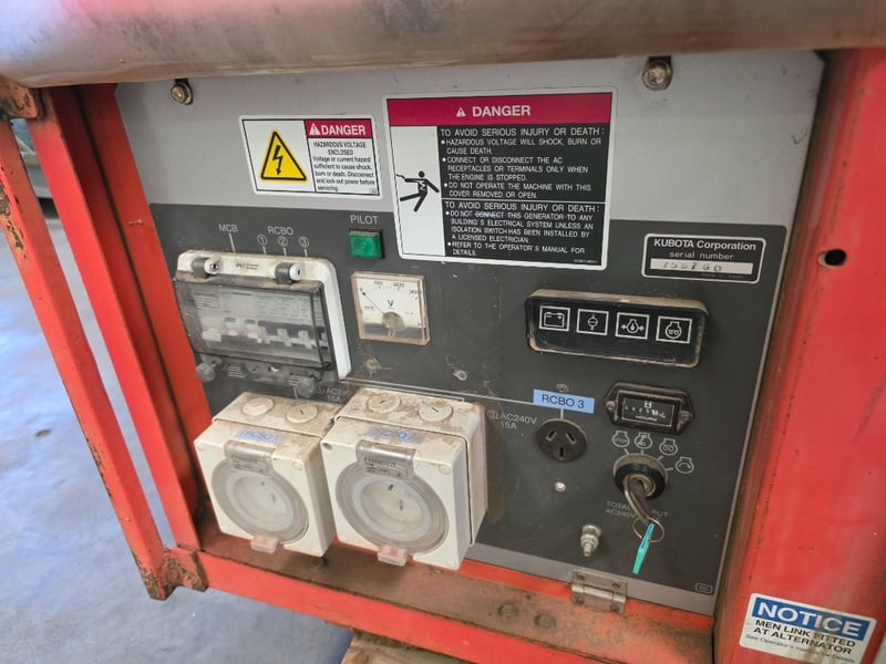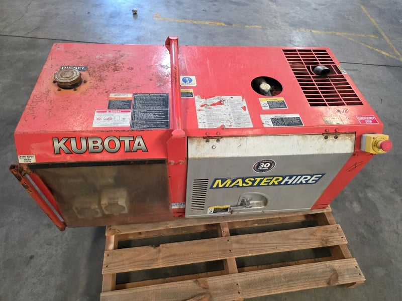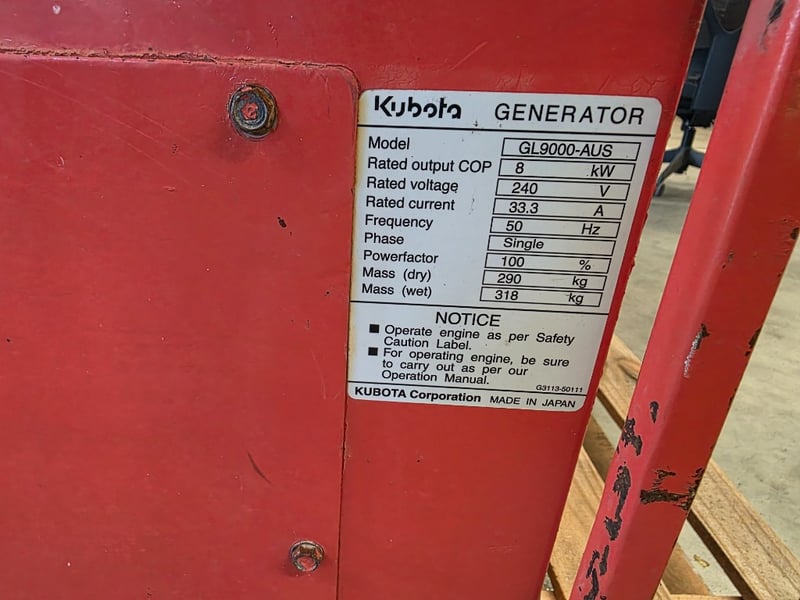9 KVA DIESEL GENERATOR KUBOTA MODEL AGL 9000 HOURS INDICATING 4,425 DESCRIPTION: Serial no. 755760 Single phase power Silenced cabinet Fork tyne holes and 1 lifting eye. Generator starts and runs, but has no power to the outlet Dimensions: .620 high 1.280 long .590 depth