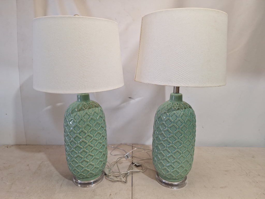 x2 Table Lamp, Glass Style, White & Green Finish Dimensions H:71cm W:38cm D:38cm SOLD AS LOT