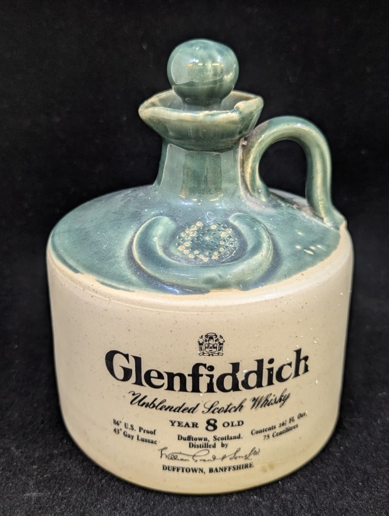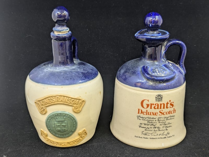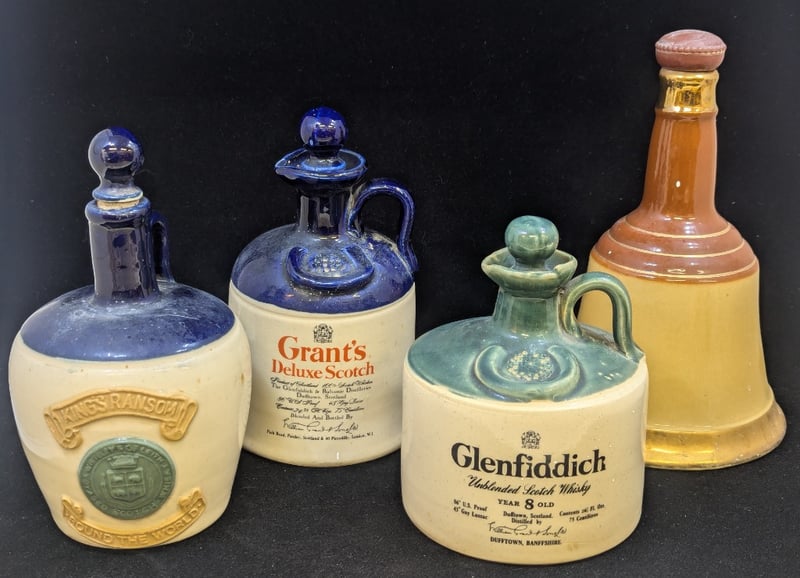 FOUR SCOTCH WHISKEY POTTERY DECANTERS Includes Glenfiddich Unblended Scotch Whiskey Decanter, Grants Deluxe Scotch Decanter, 'Kings Ransom Round The World' Decanter, Bell'S Scotch Whiskey Decanter, Item Heights Range From Approx: 17Cm - 25Cm Condition: Good - Refer To Images 584943+3