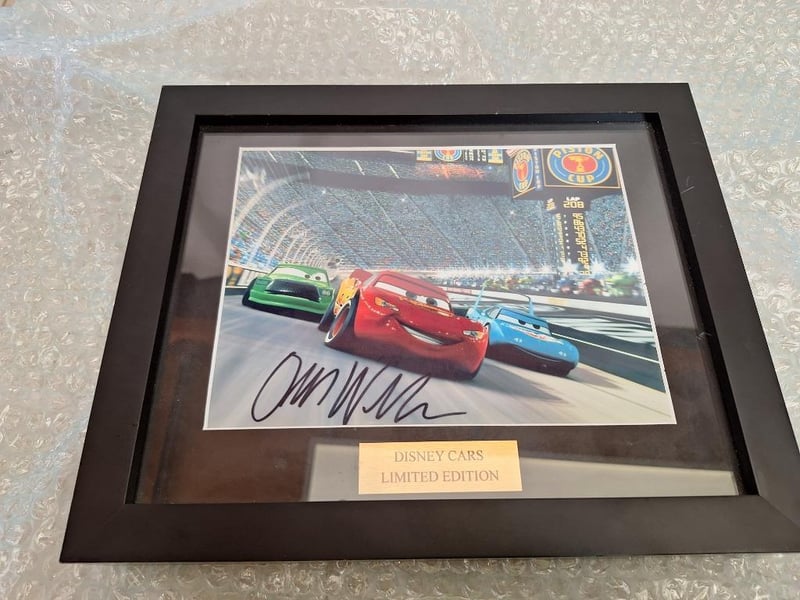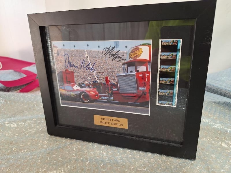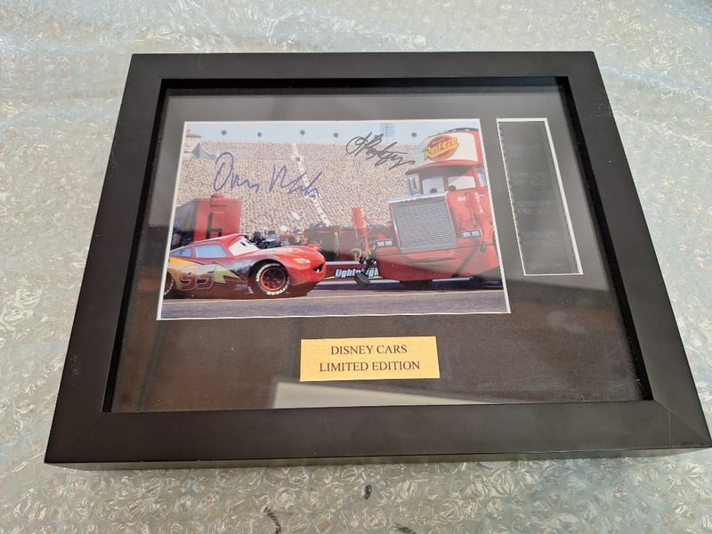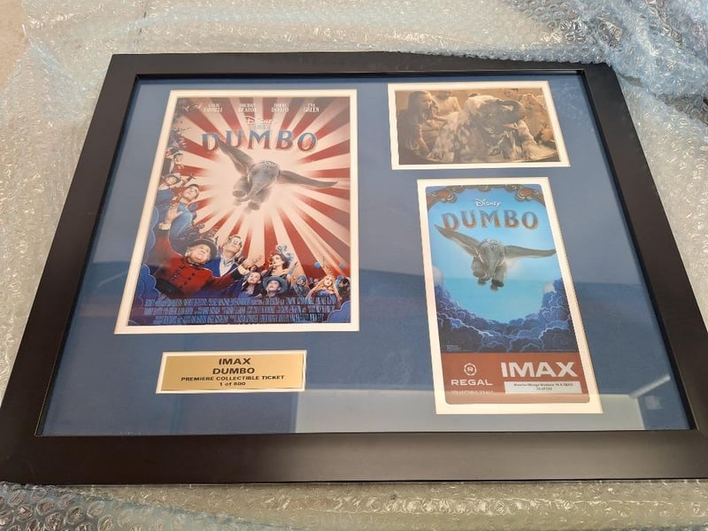 COLLECTABLES: 1 x IMAX DUMBO Premiere Collectible tickets 1 of 500 framed wall hanging with black frame, measures H:40.5 x W:51 x D:2cm, 2 x DISNEY CARS Limited Edition signed wall hanging with black frame, measures H:23 x W:28 x D:3.5cm
