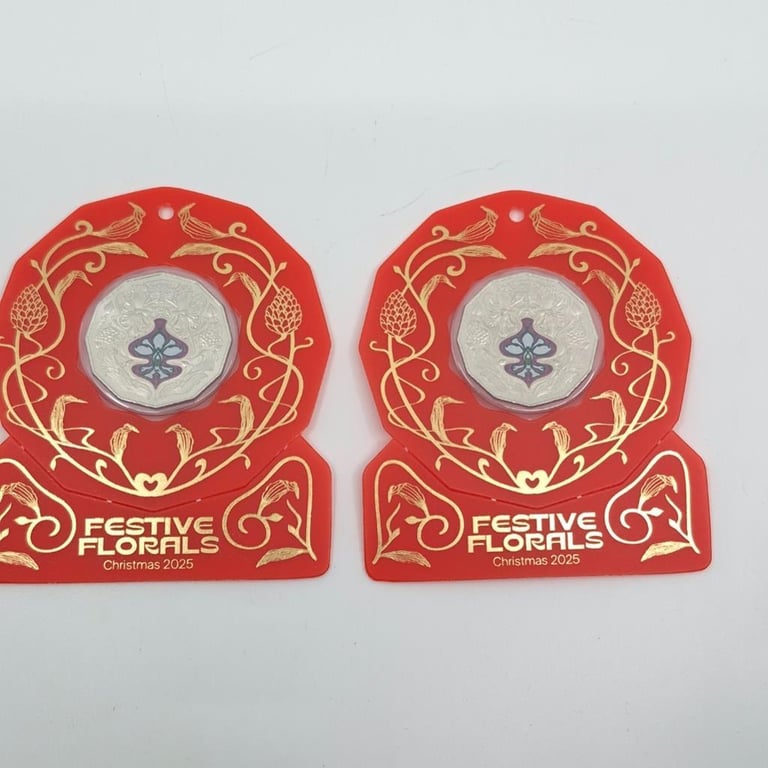TWO ROYAL AUSTRALIAN MINT SCARCE 2025 CHRISTMAS FESTIVE FLORALS COLORISED COLLECTOR COINS. UNCIRCULATED Condition: Good587689+71