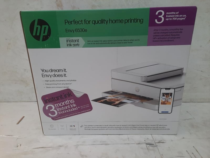 RRP $99, HP Envy 6530e All-in-One Printer Instant Ink Enabled The HP Envy 6530E is a printing, copying and scanning solution perfect for your home or work office setup. It has a steady printing speed of 10 ppm, and a uses ink-jet technology for vivid production on your pages. It has a document tray with a 100 sheet capacity, making it easy to stay stocked up and ready for use throughout the day.